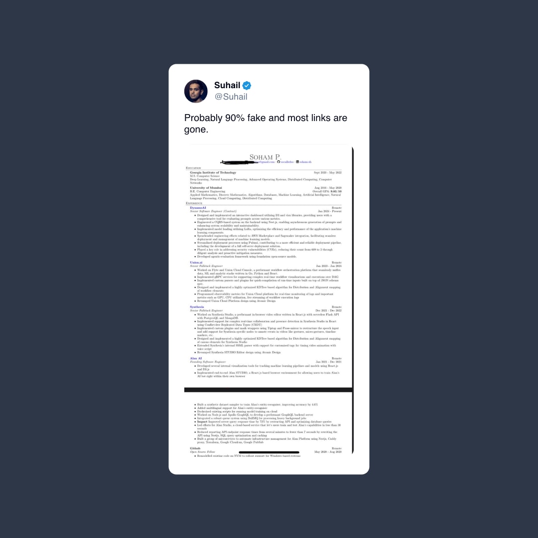 Even though we aren’t sure Parekh attached his CV right off the bat, he did have a brief but polished resume on hand (shared on X by Suhail Doshi, CEO of Playground AI and the one who first exposed Soham’s shenanigans).