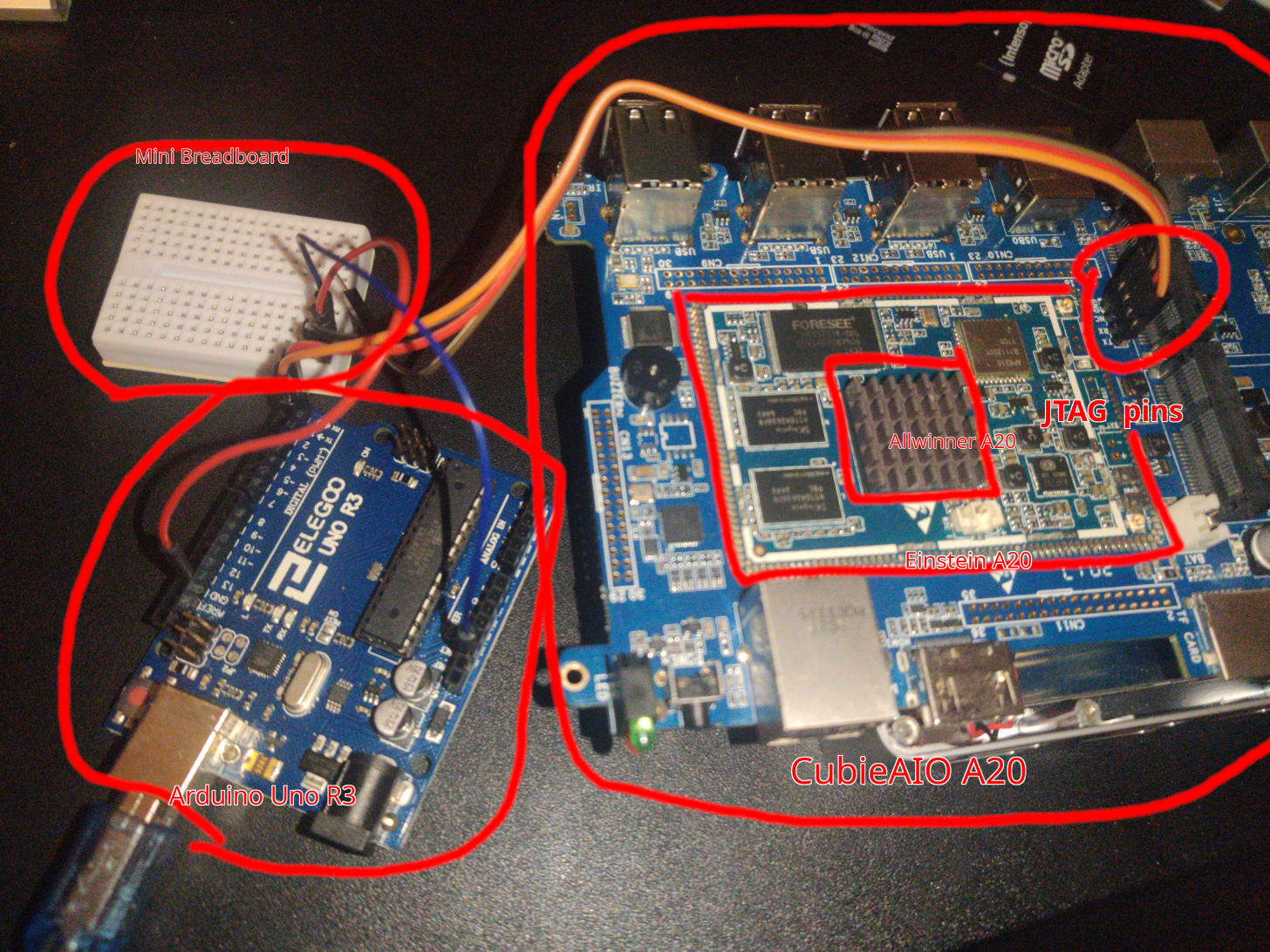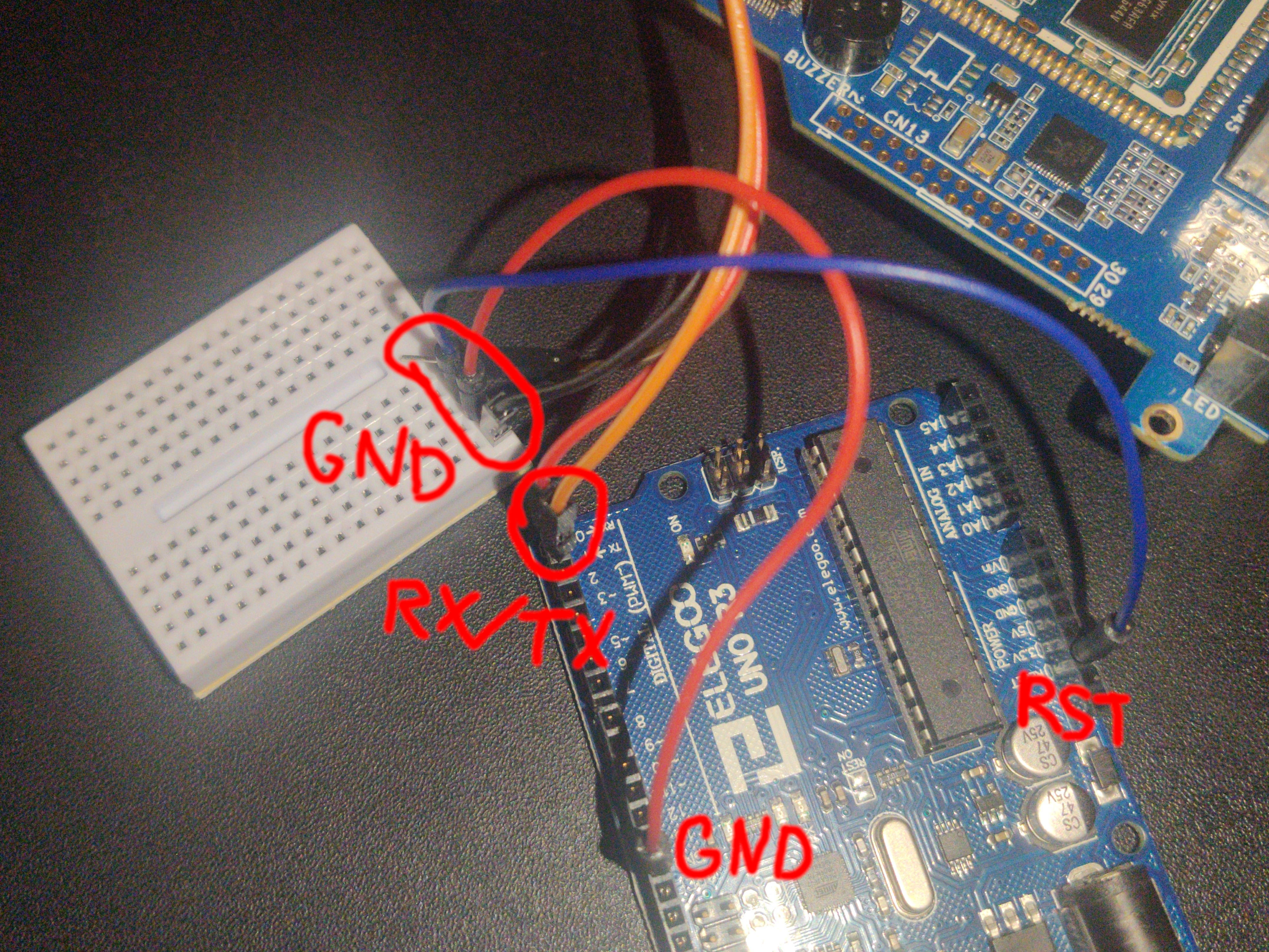 I lobotomized the Arduino by wiring RESET to GND, so the microcontroller stayed inert. Then I hooked up its TX/RX to the Cubie’s serial pins and ran screen on my laptop. At first—nothing. No output. I shorted RX and TX on the Arduino just to test the loopback, and it echoed my keystrokes fine. So I swapped the Cubie TX/RX wires—because UART pin labeling is a mess—and boom. U-Boot logs, scrolling across my terminal. I was in.