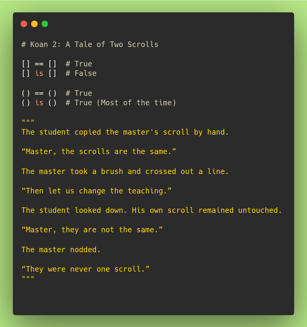 print([] == []) # True - same contents (both empty) print([] is []) # False - distinct list objectsPython creates a new list each time you write []. They are separate, though they appear the same. Like the student’s scrolls, word-for-word identical, yet changes to one do not touch the other.