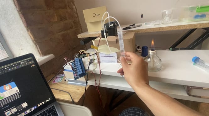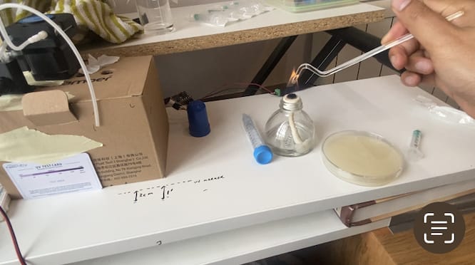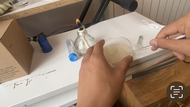 When the pump was in action and taking solution out of the tube, I lighted an ethanol lamp to create an updraft of air. This updraft prevents contaminants from getting in the tube, since its open. It’s cheaper than a Bunsen burner.