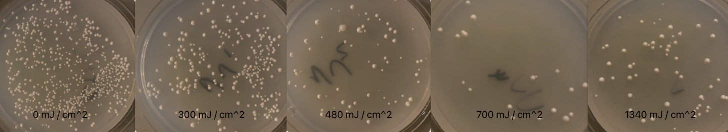 After running the yeast through UV, and before plating the solution, I first dipped a glass rod in pure ethanol. Then put it in the flame. I waved the rod in the air for a few seconds to cool it. Then I dipped it in the treated yeast solution and spread it on the plate.