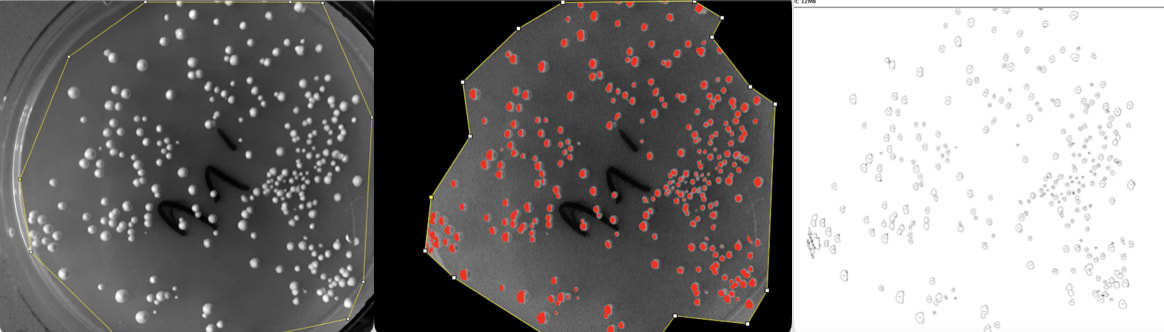 To count the colonies automatically, I used Fiji. I increased the contrast, set a threshold to detect the high contrast colonies, then used Fiji’s particle analysis tool.