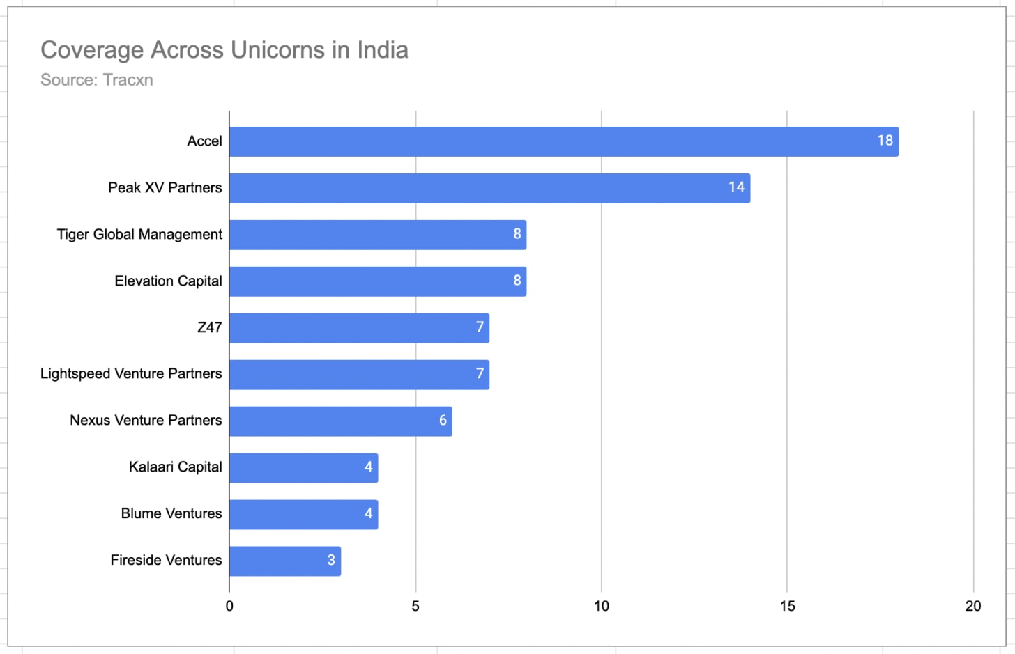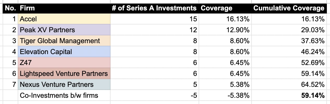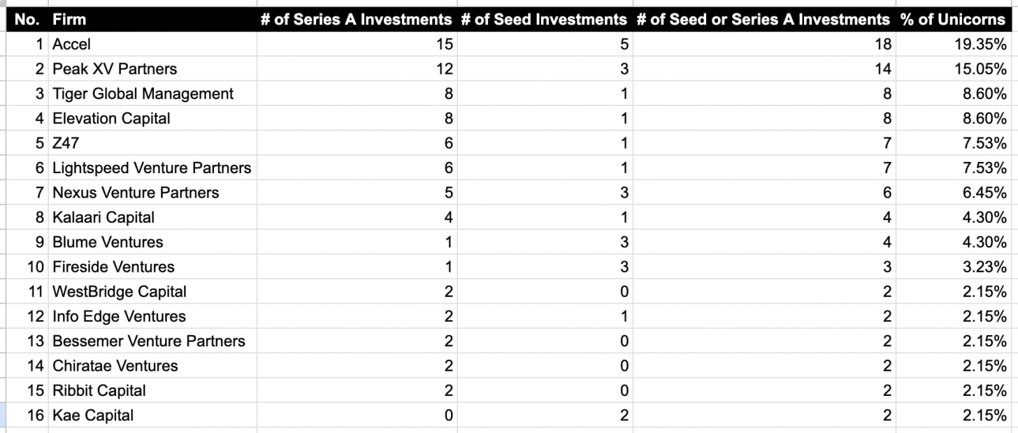 The answer was, unsurprisingly, very important. Just 7 firms led the Series A of ~60% of startups that are worth $1B+ today. The list of firms is just as predictable - Accel, Peak XV Partners, Tiger Global Management, Elevation Capital, Z47 (fka Matrix Partners India), Lightspeed India Partners and Nexus Venture Partners.