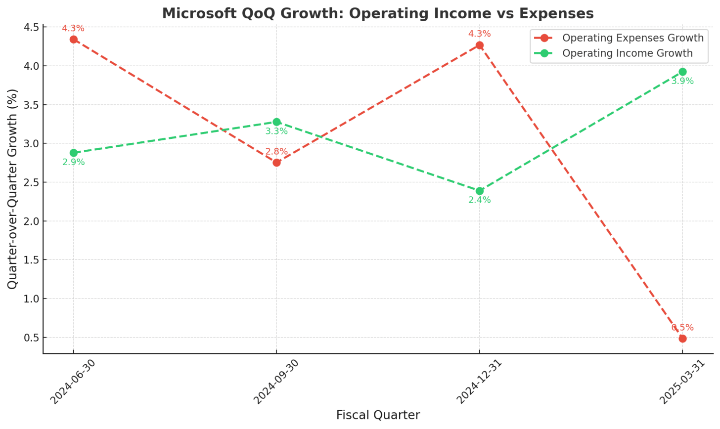 tl;dr: In its FY2025 Q3 financial statement (ended March 31, 2025, 10-Q), Microsoft posted $32.0B in operating income, up 16% YoY, with only a modest 2.4% YoY increase in operating expenses. This is a textbook case of AI-driven productivity, resulting in more output and lower costs. Expect this profit-efficiency trend to spread fast across the industry.