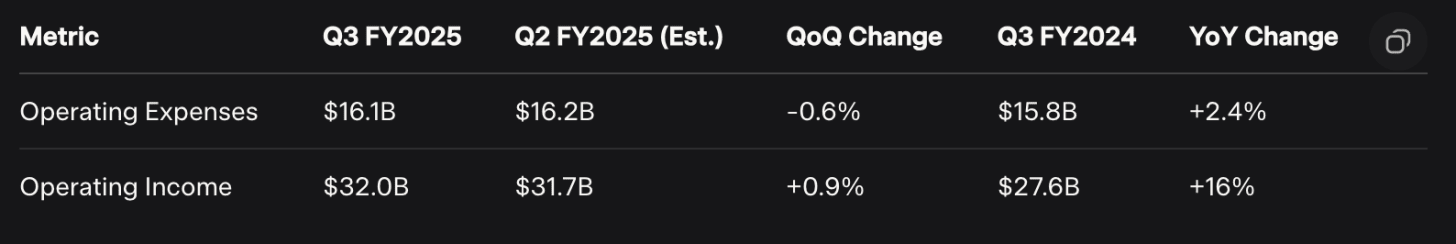 🟥 Operating Expenses Notice the slight decline 📉 QoQ from $16.2B in Q2 to $16.1B in Q3, and a slowing YoY growth rate from ~5.3% in Q2 to ~2.4% in Q3, a potential signal that cost efficiency is possibly due to AI-enabled productivity and reduction in workforce cost. 10-Q