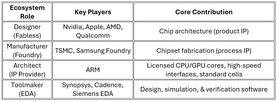 IP core providers like ARM, who license ready-made building blocks used in chips. Things like CPU cores, graphics engines, and communication controllers.
