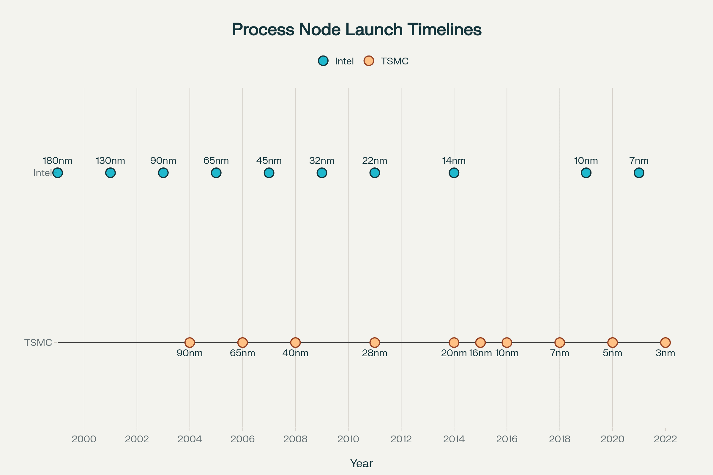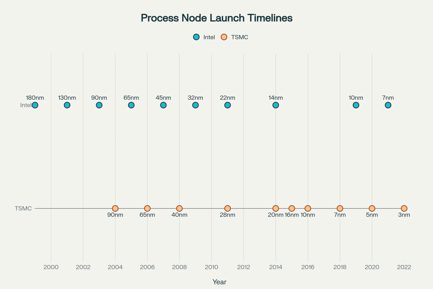 First, it missed the smartphone wave entirely. Then came a misfire: betting big on its own low-power Atom chips that never caught on. Meanwhile, its greatest strength — manufacturing — began to falter. The once-reliable cadence of process improvements slipped. Intel’s long-promised 10nm node arrived years late.