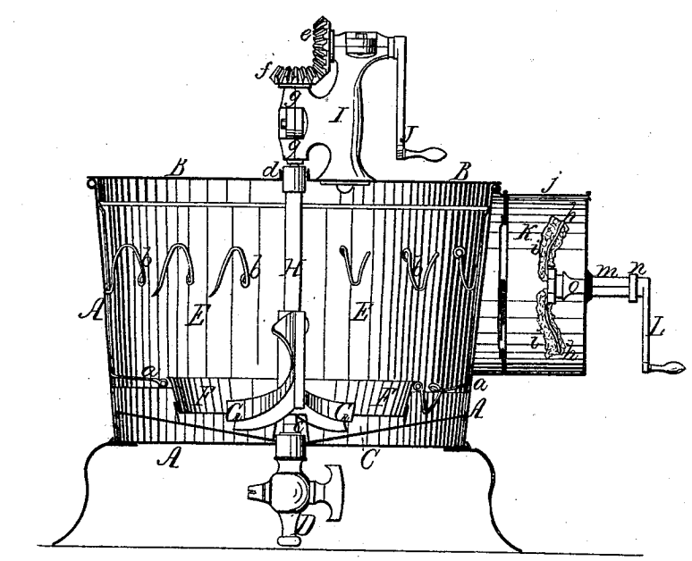 In the mid-nineteenth century, inventors made the first steps towards mechanizing dishwashing. In the United States, the first dishwasher patent was granted in 1850. This dishwasher (or ‘table furniture cleaning machine’, as its inventor called it) was a large tub with a rotatable dish rack in one half and a paddle wheel in the other half. The user would load the dishes, heat up some water separately, pour the hot water into the machine, and then crank the paddle wheel with one hand to throw water onto the dishes, while their other hand (or an assistant) spun the dish rack. This was an awkward process, and probably also ineffective – the water splashed onto dishes with the little scoop wouldn’t have enough power to replace scrubbing.