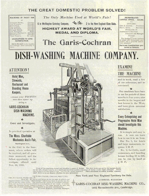 Unlike previous dishwasher inventors, Cochrane manufactured her machine at scale and built a company. She established her factory near Chicago, and traveled throughout the Midwest to demonstrate and sell the machines. The 1893 Chicago World’s Fair was a great showcase for her dishwashers: they were on display in the Machinery Hall and in the Women’s Building, and they were in use behind the scenes at the fairground’s restaurants. They were also installed in many of the hotels that Chicago built for World’s Fair visitors.