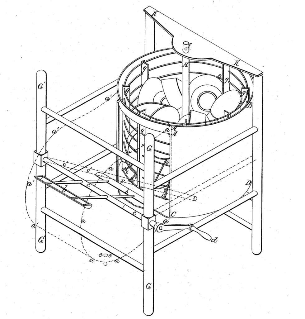 Their design was the beginning of a flurry of new dishwasher patents. Between 1863 and 1888, the US Patent Office granted more than 60 patents for dishwasher designs and improvements. Many of the designs were remixes of the same key elements: dish racks, tubs of water, various hand-cranked mechanisms for splashing the water up onto the dishes. Some designs involved submerging the entire dish rack, and spinning it around underwater to clean the dishes. Others expanded on the ‘revolving sponge’ idea: for example, a machine that sandwiched a plate between two brushes, and dipped the whole plate-and-brush sandwich underwater while the brushes rotated in opposite directions. Still others invoked centrifugal force, conveyor belts, or springs.