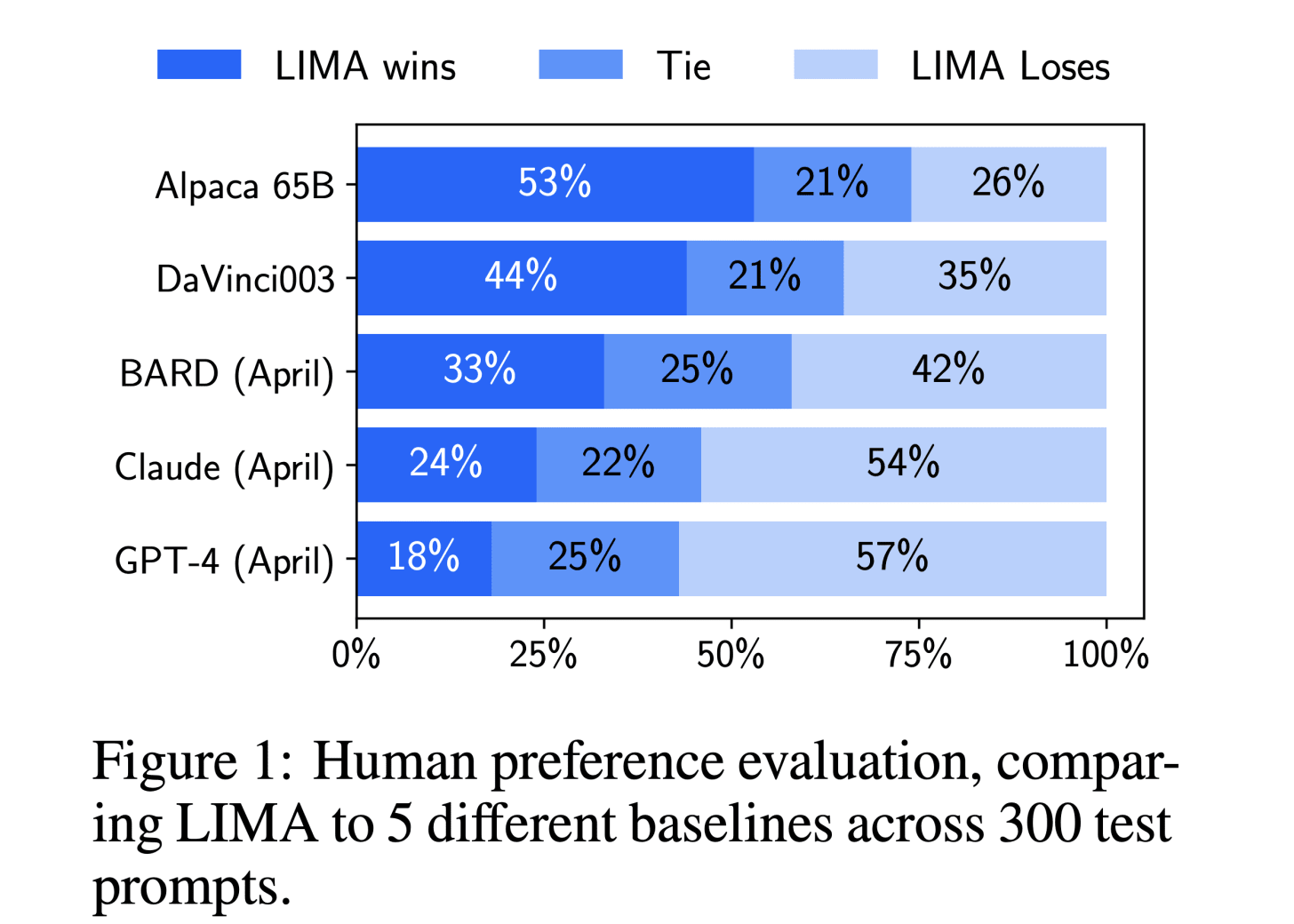 Figure 1 from the paper contains the results for the experiment measuring human preferences on the authors’ fine-tuned model, LIMA, versus the baselines. We can see that for all baselines, save Claude and GPT-4, a majority of the responses from LIMA are either equivalent or strictly preferred. Surprisingly, a nontrivial number of responses from LIMA are equivalent or preferred to those from Claude and GPT-4. And this is from a model fine-tuned on a mere 1000 samples!