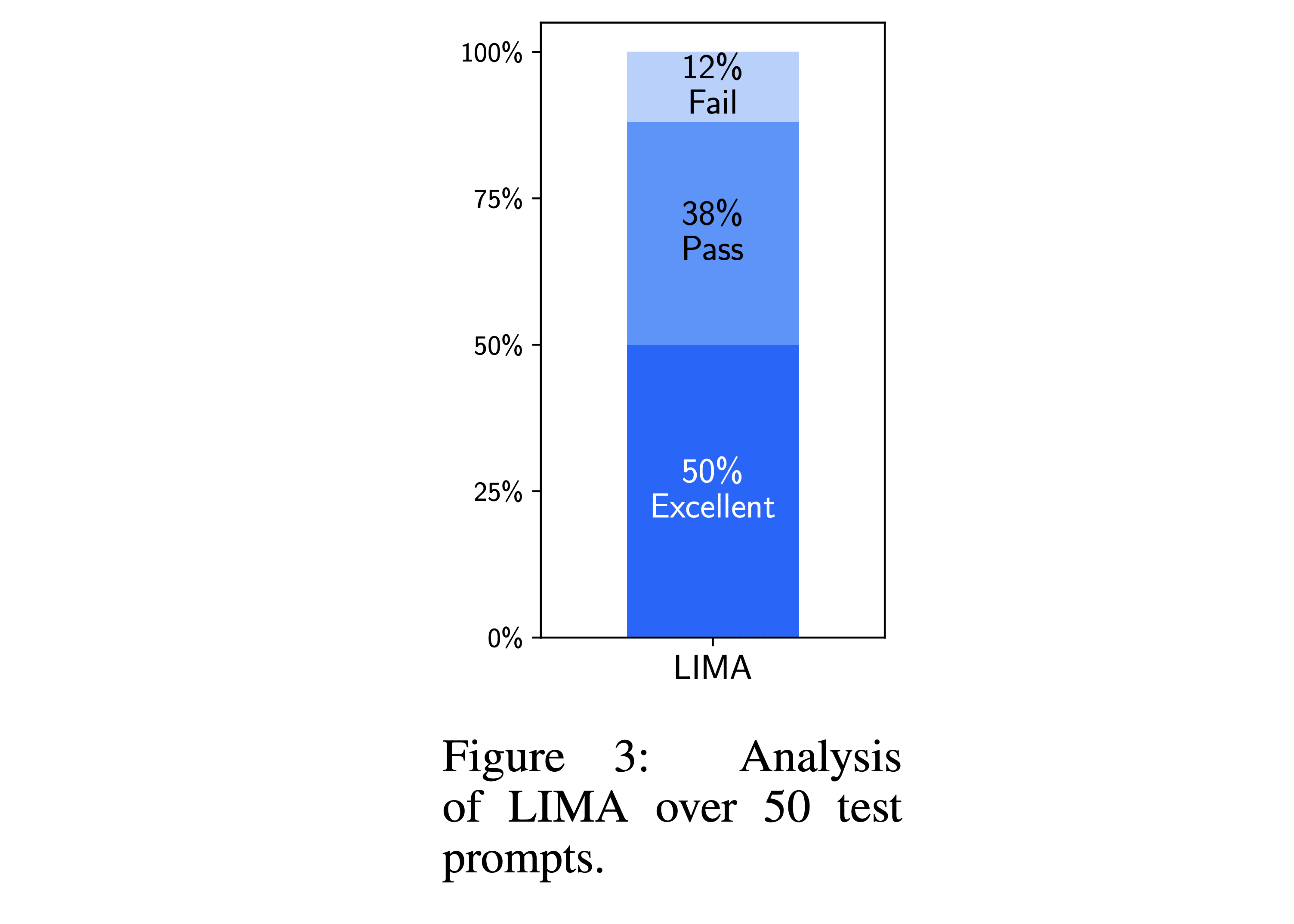 Figure 3 shows the results from, in a sense, measuring LIMA against itself. Human annotators were asked whether the responses from LIMA over 50 test prompts were “excellent”, “passable”, or “fails”. Only 12% of the responses were rejected by the human annotators.