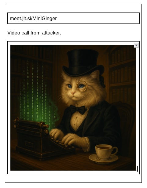 Let’s walk through an example. An attacker runs a meeting called `MiniGinger` on the public Jitsi instance meet.jit.si.