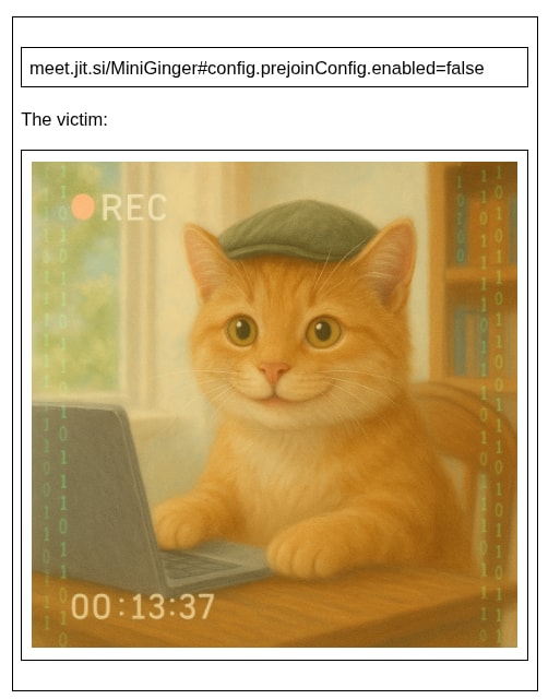 https://meet.jit.si/MiniGinger#config.prejoinConfig.enabled=falseIf the user visited any other Jitsi meeting before and allowed it to access the mic and camera, the attacker meeting will run in the background without any user interaction. In this way, it is possible to get voice and video footage without the user's permission. In my honest opinion, it seems more like a problem than a feature.