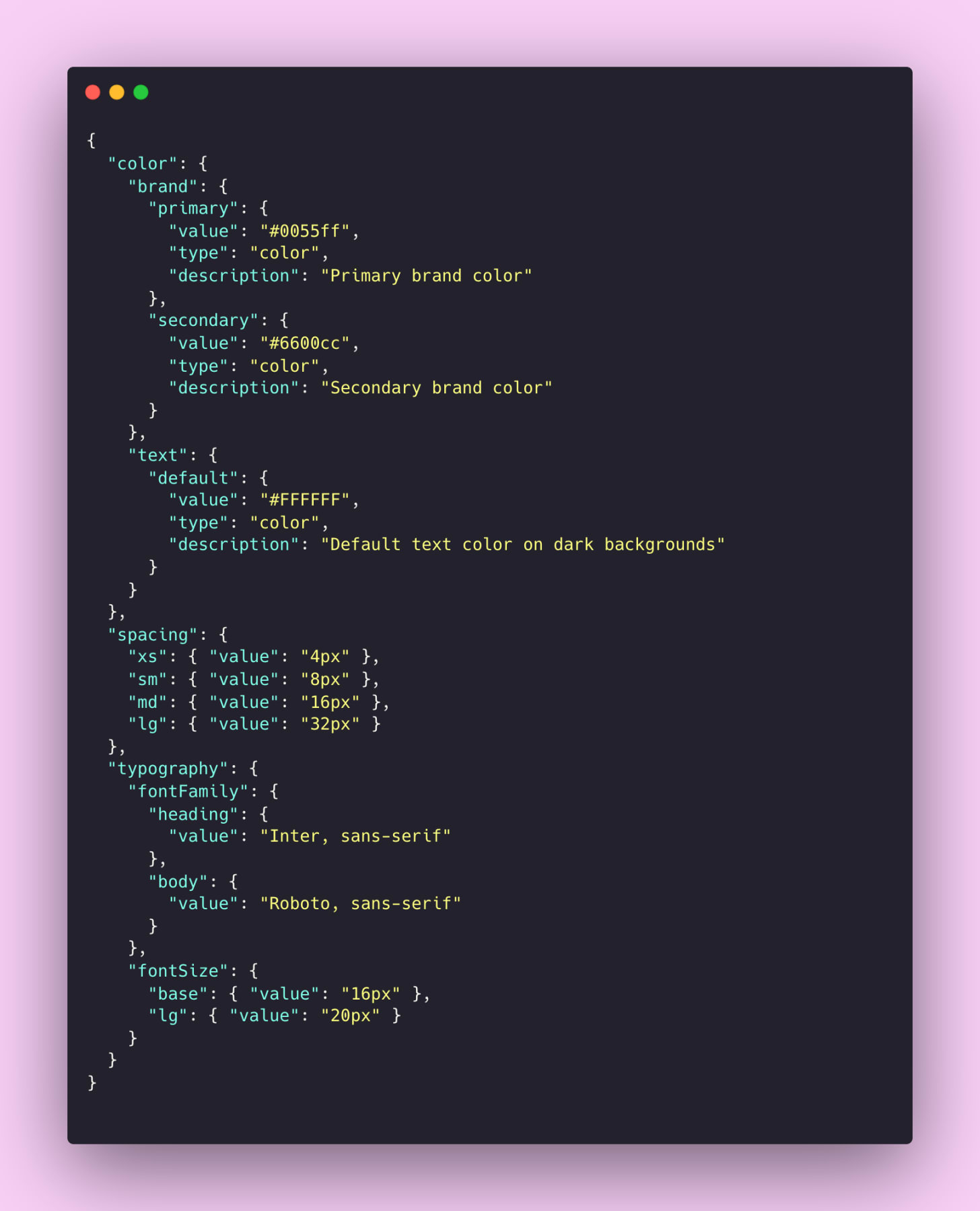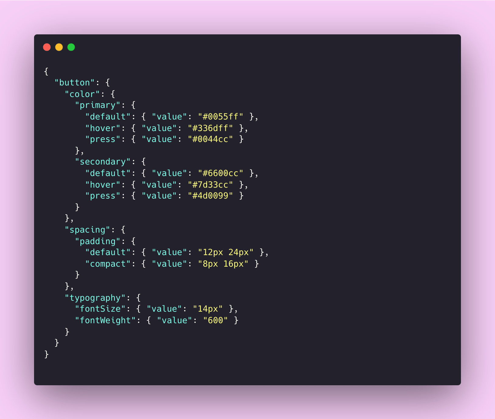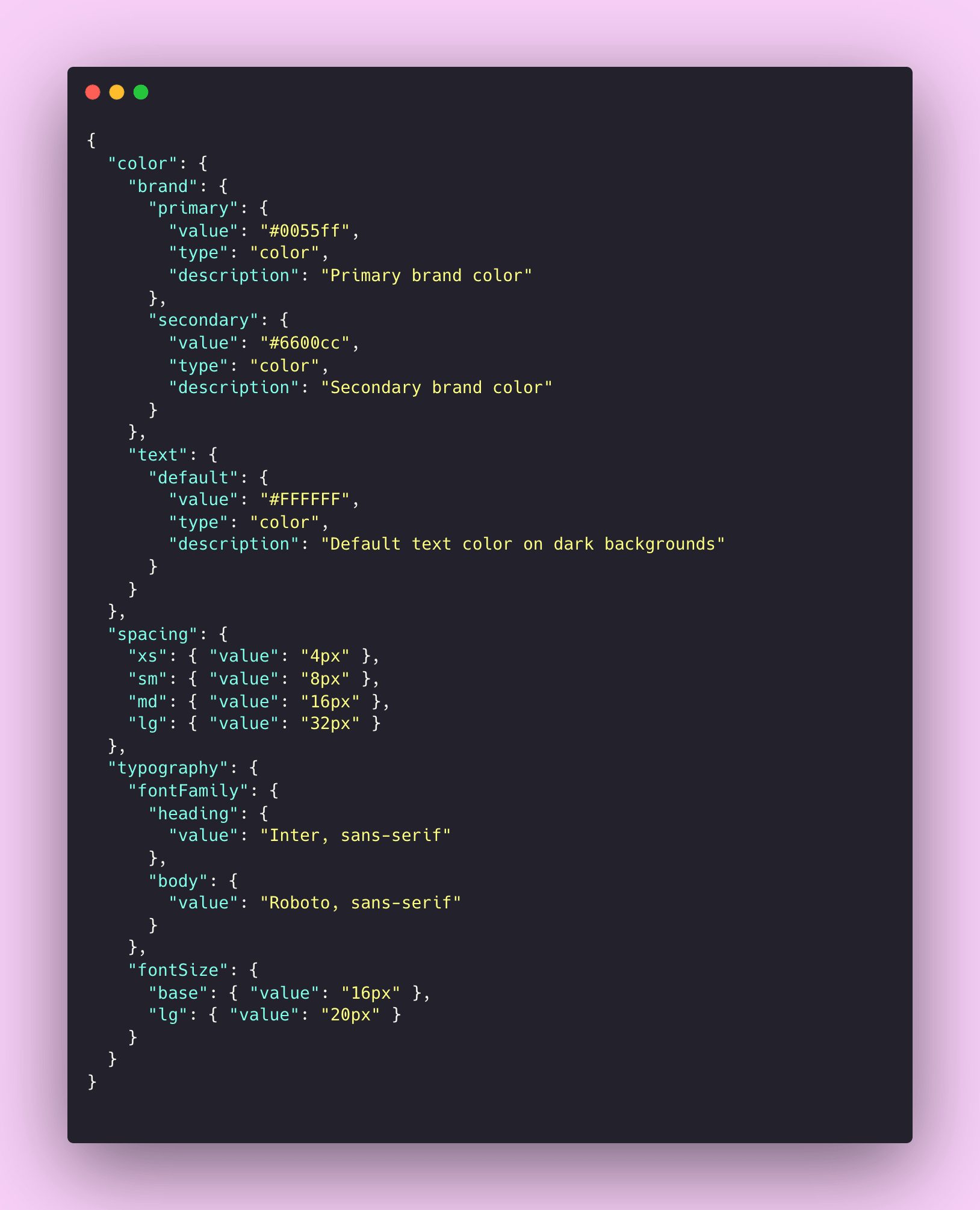 Design tokens are typically stored and exchanged in JSON format because it's structured, portable, and easy to transform. Here's what a design token file might look like: