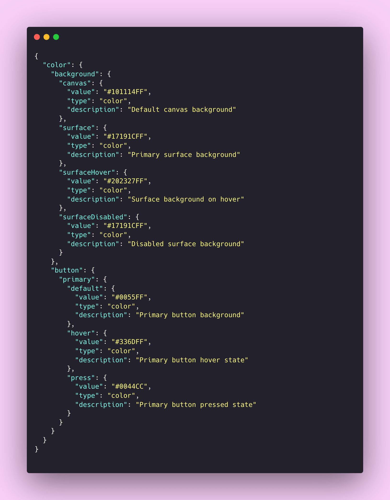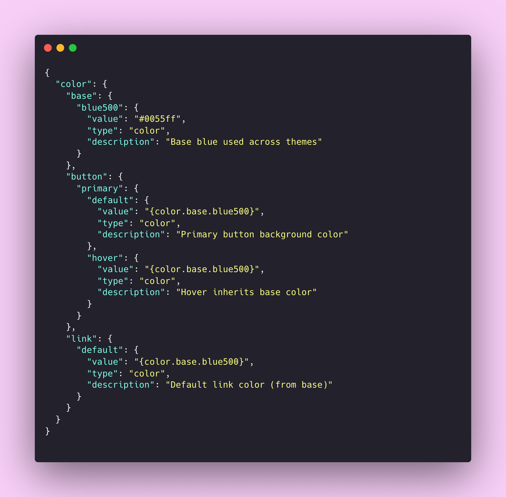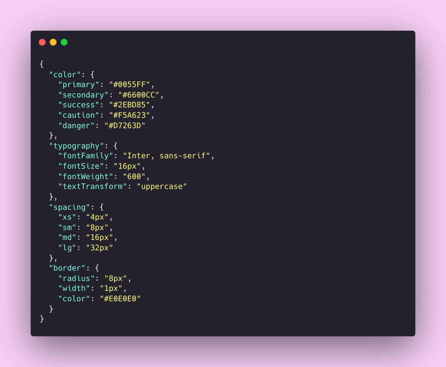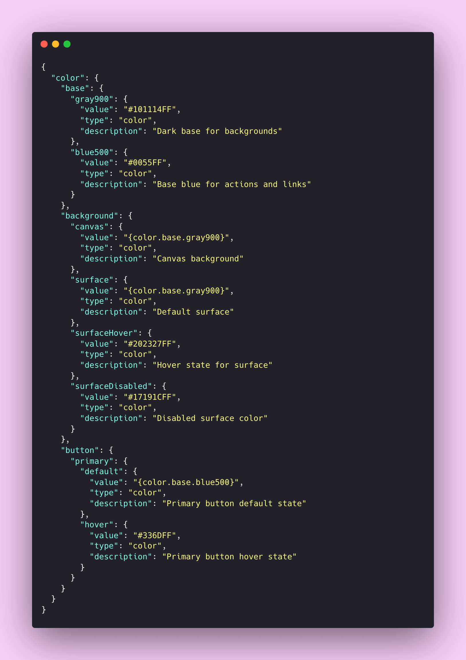 Design tokens are typically stored and exchanged in JSON format because it's structured, portable, and easy to transform. Here's what a design token file might look like: