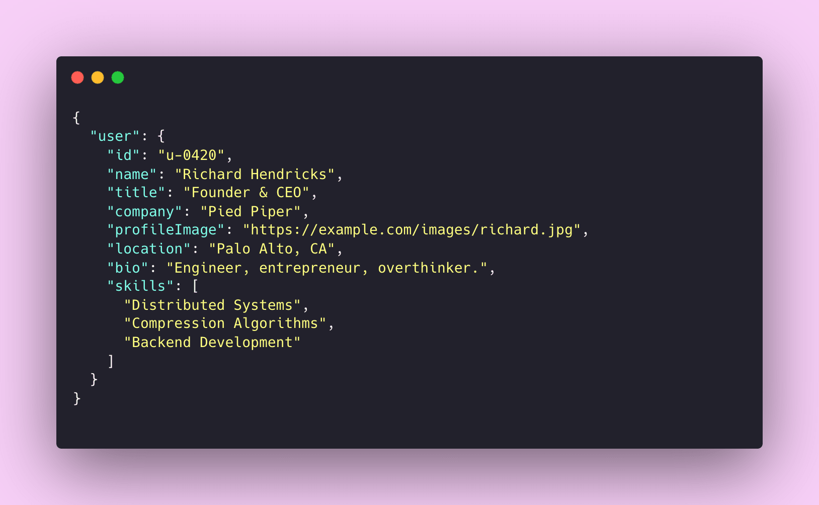 APIs typically send and receive data in JSON format, which means the content populating your carefully crafted interfaces is likely structured as JSON. Here's a real-world example of what an API might return for a user profile: