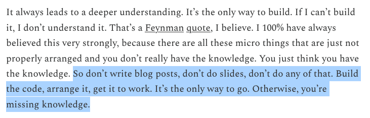 But here's the nuance he missed: if you're an engineer, writing — or creating a slide deck, or teaching something — is one of the most powerful ways to build understanding. Why? Because explaining something forces clarity. You can't hide behind hand-wavy intuition when your audience knows the topic. You have to go deep. You have to really understand it.