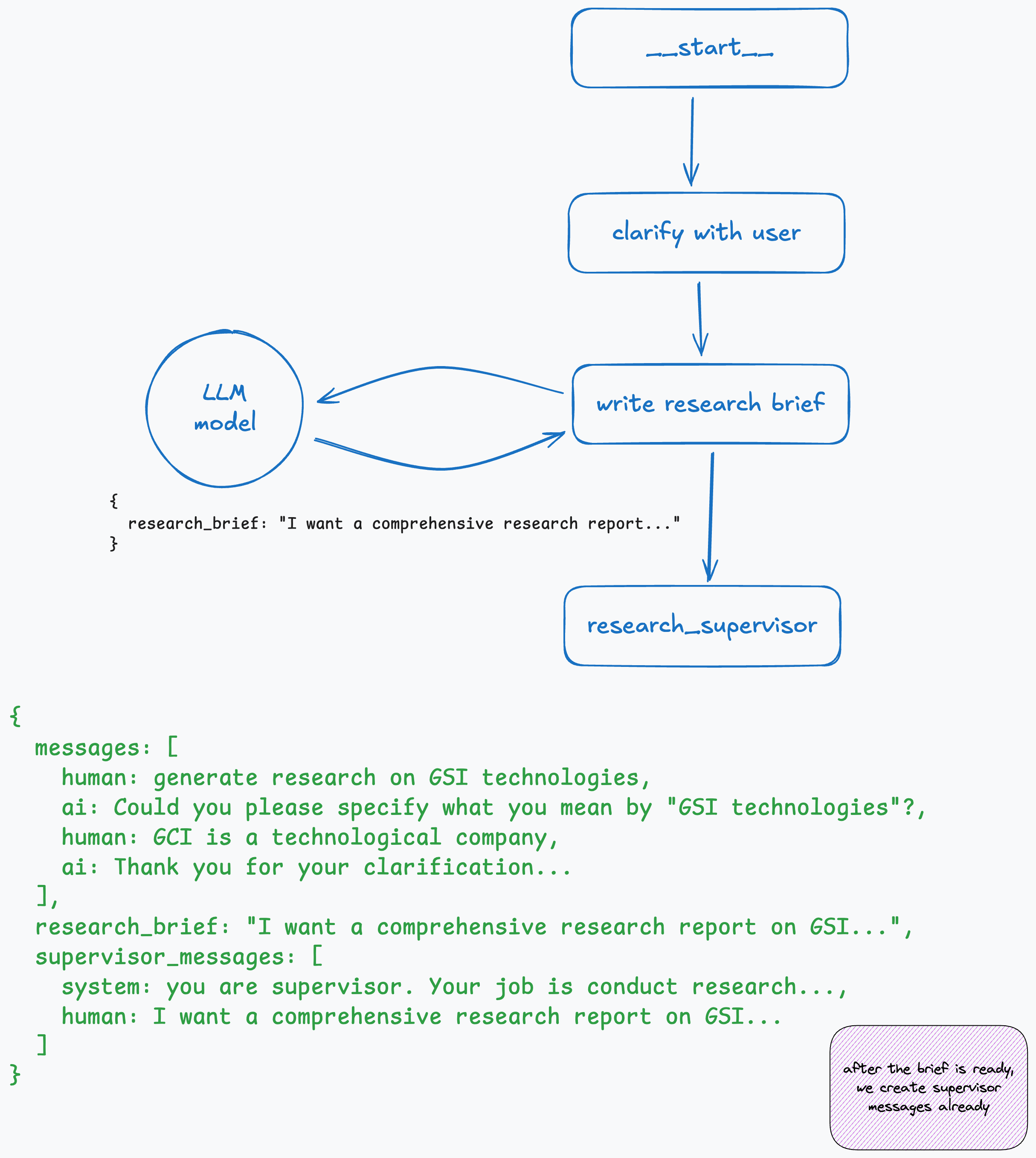 We also prepare the initial state for the supervisor subgraph. It’s stored in supervisor_messages inside the state and starts with the system prompt and the brief that was just generated.