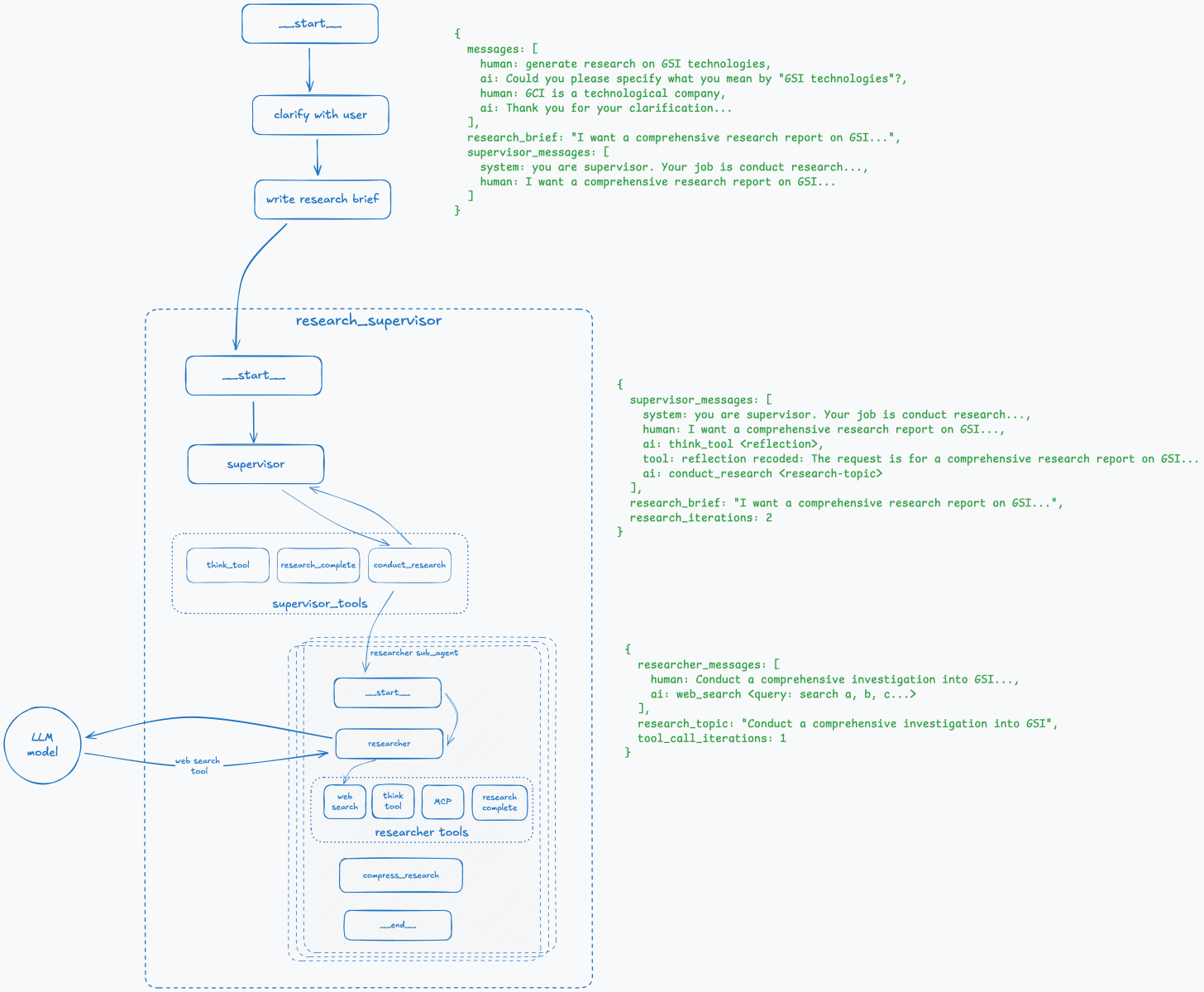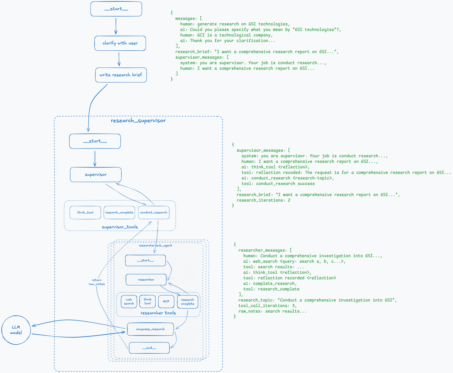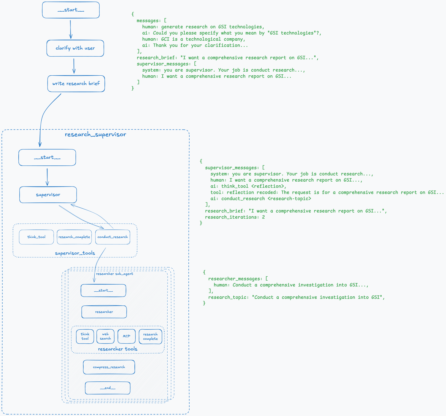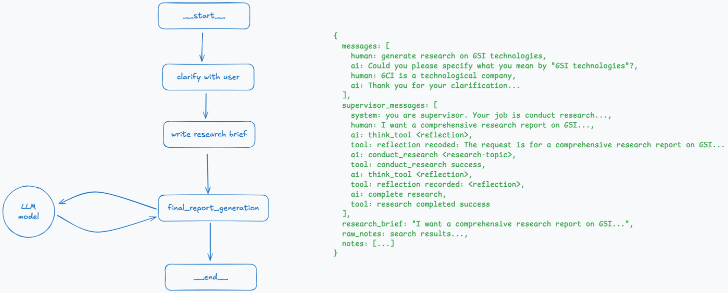 The best way to describe it is to walk through an example step-by-step and see how the overall graph and state of the deep research agent change at each step.