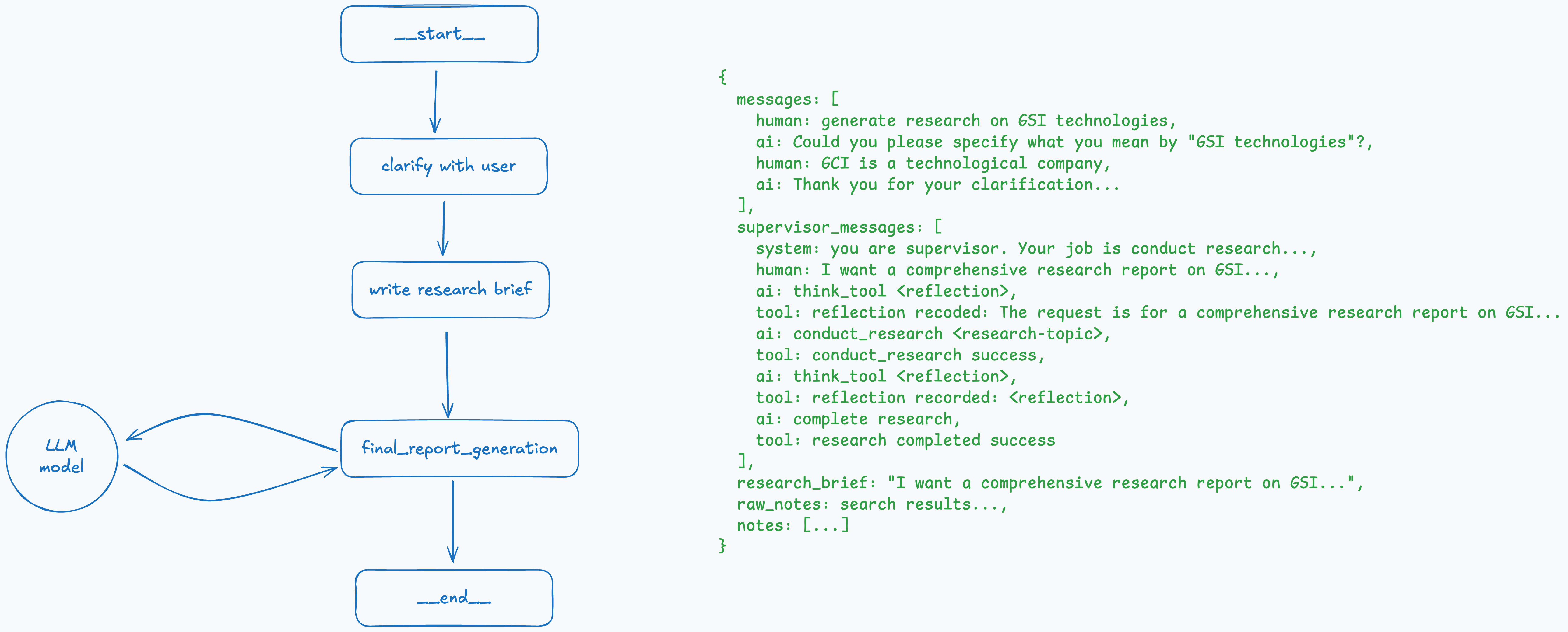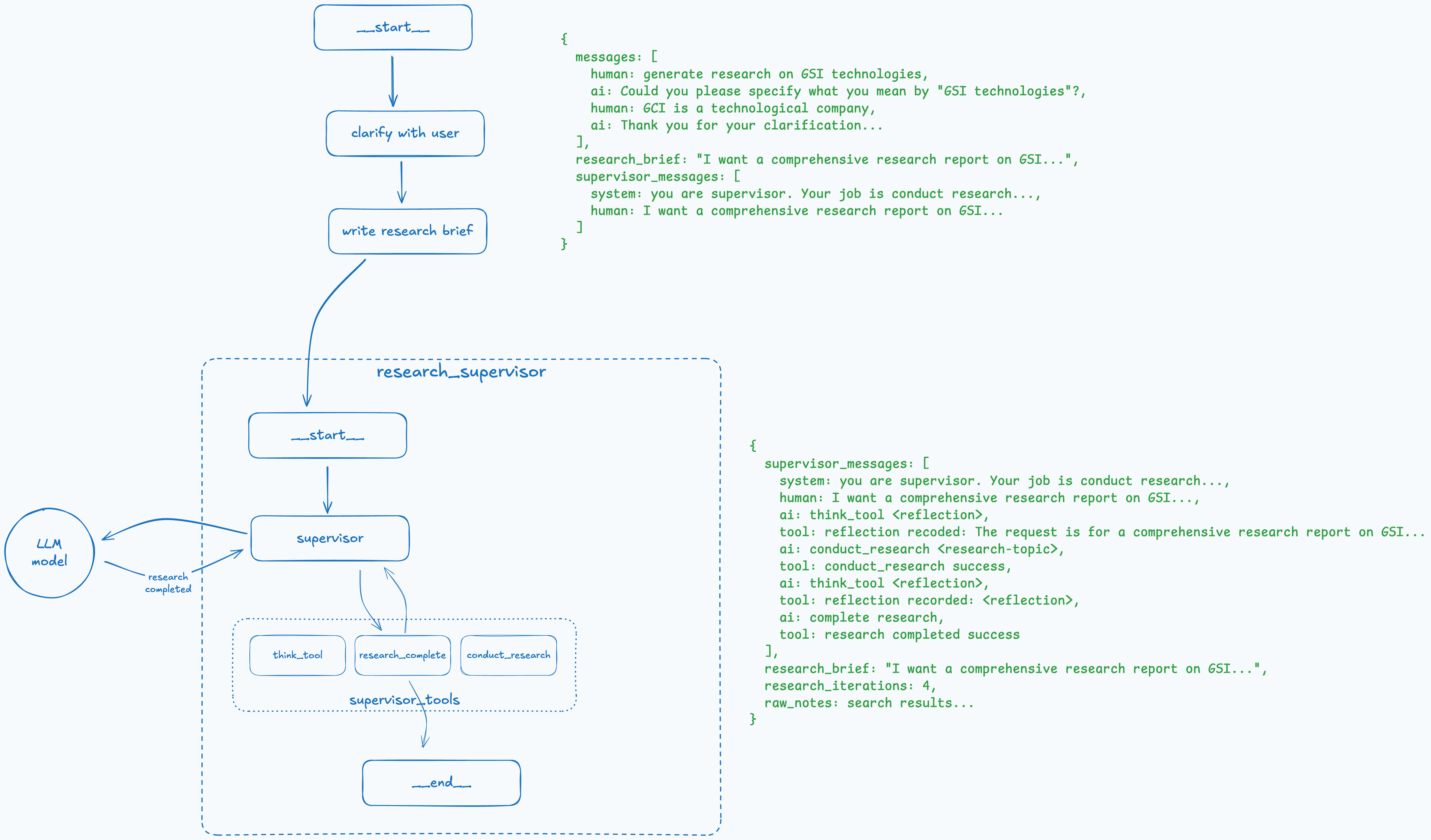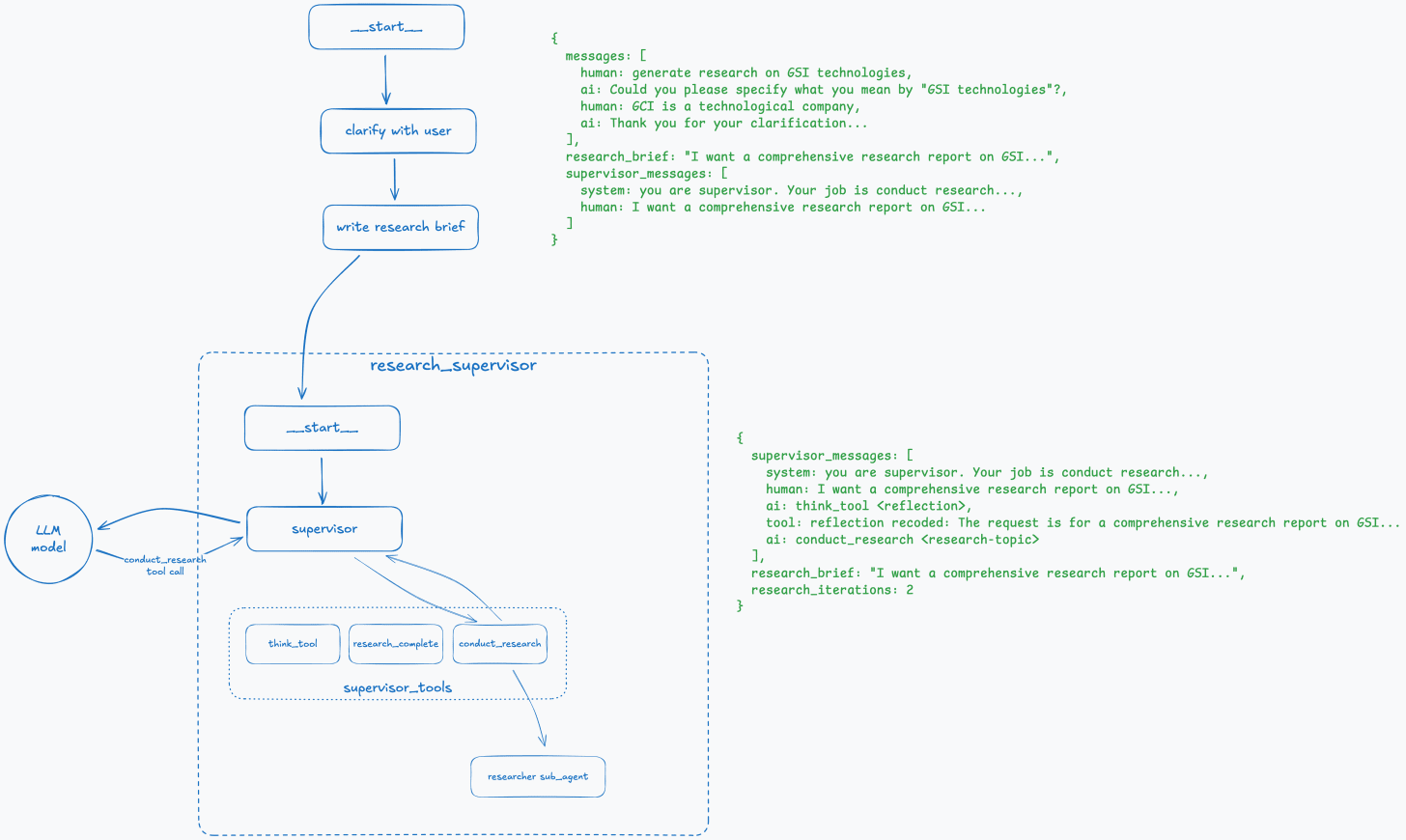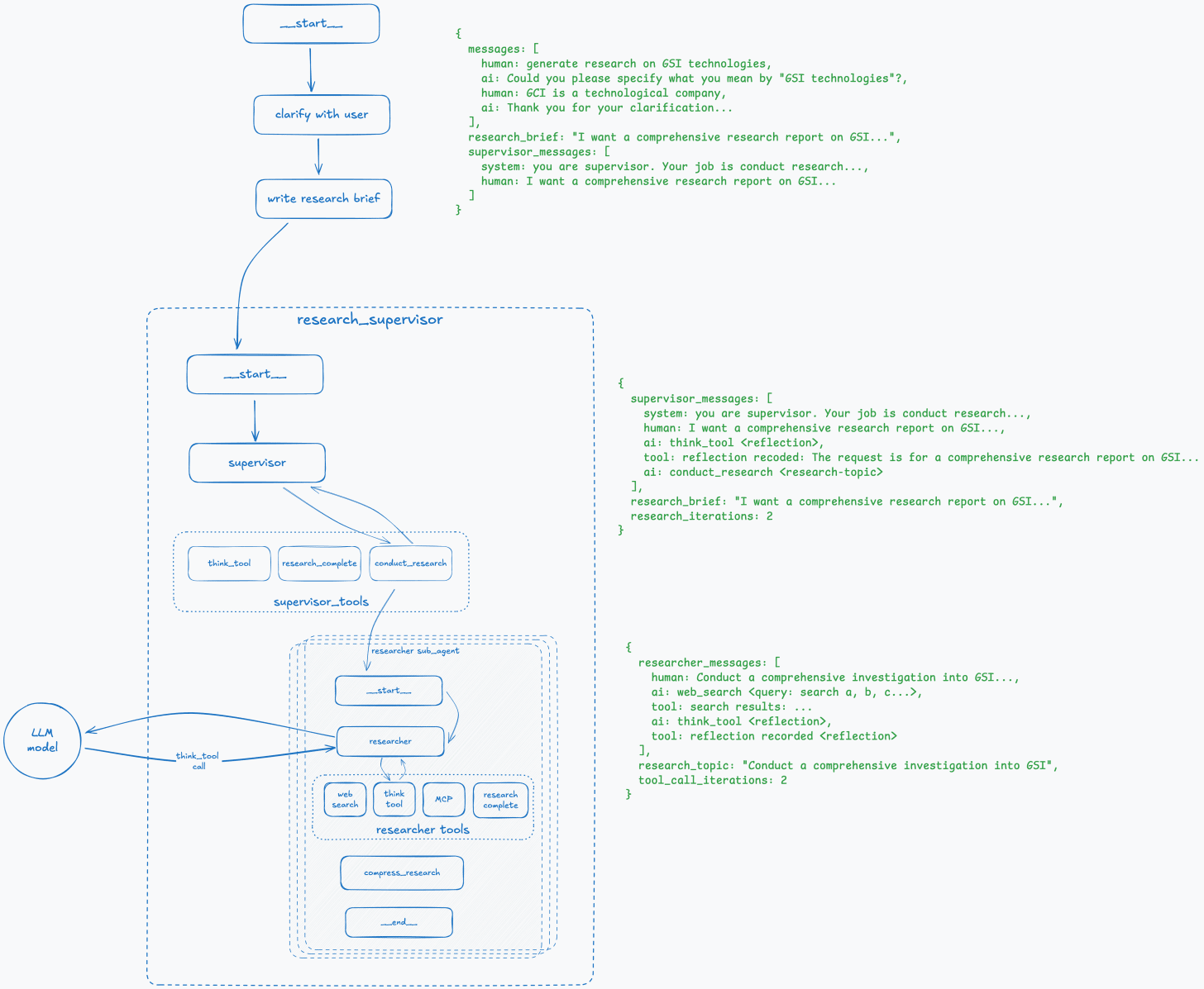 The best way to describe it is to walk through an example step-by-step and see how the overall graph and state of the deep research agent change at each step.