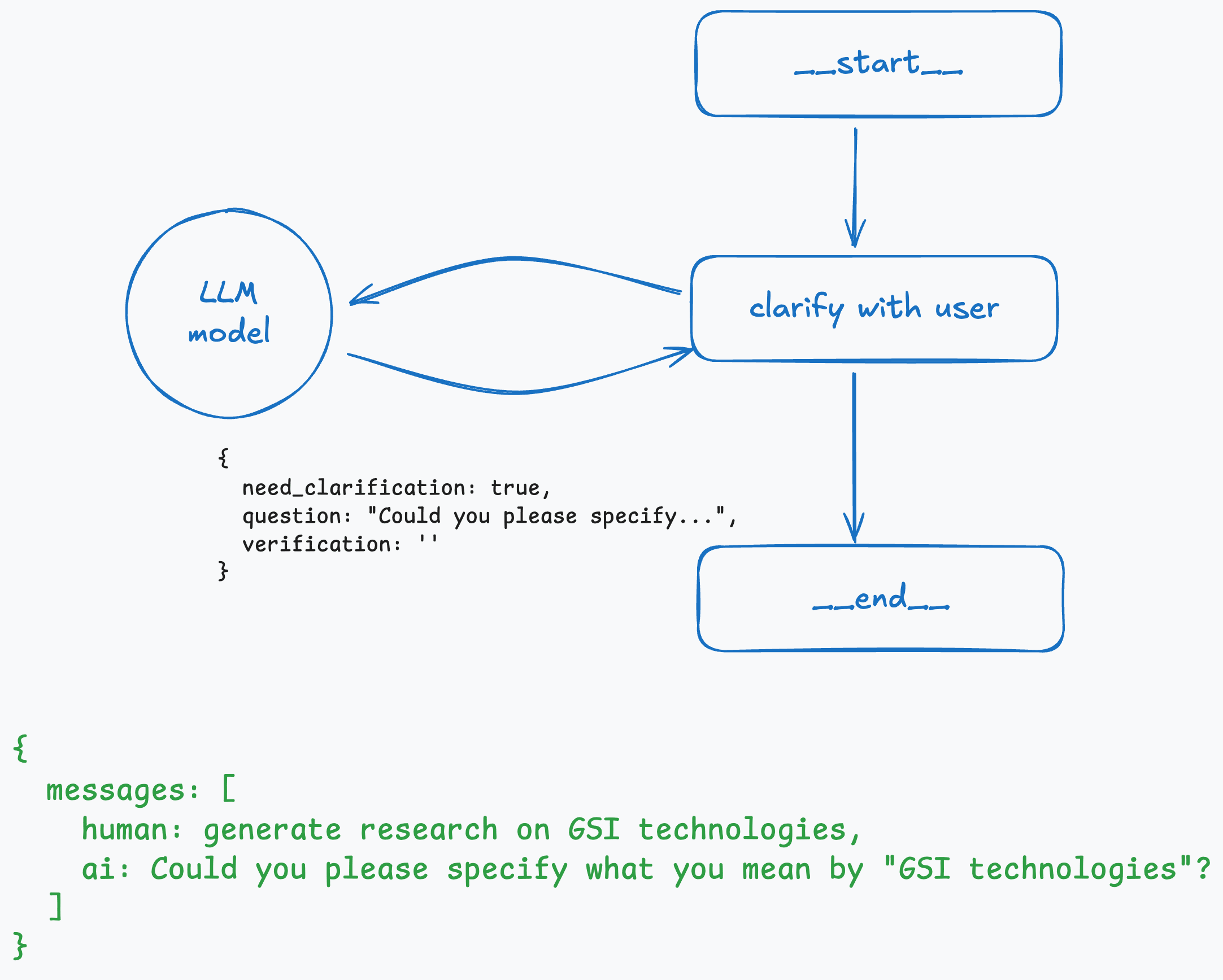 It all starts with the user question. The LLM decides, using structured output, whether it requires any clarification from the user. If so, it returns the corresponding boolean value and a follow-up question that is sent to the user. The state at this stage is simple: an array of messages.