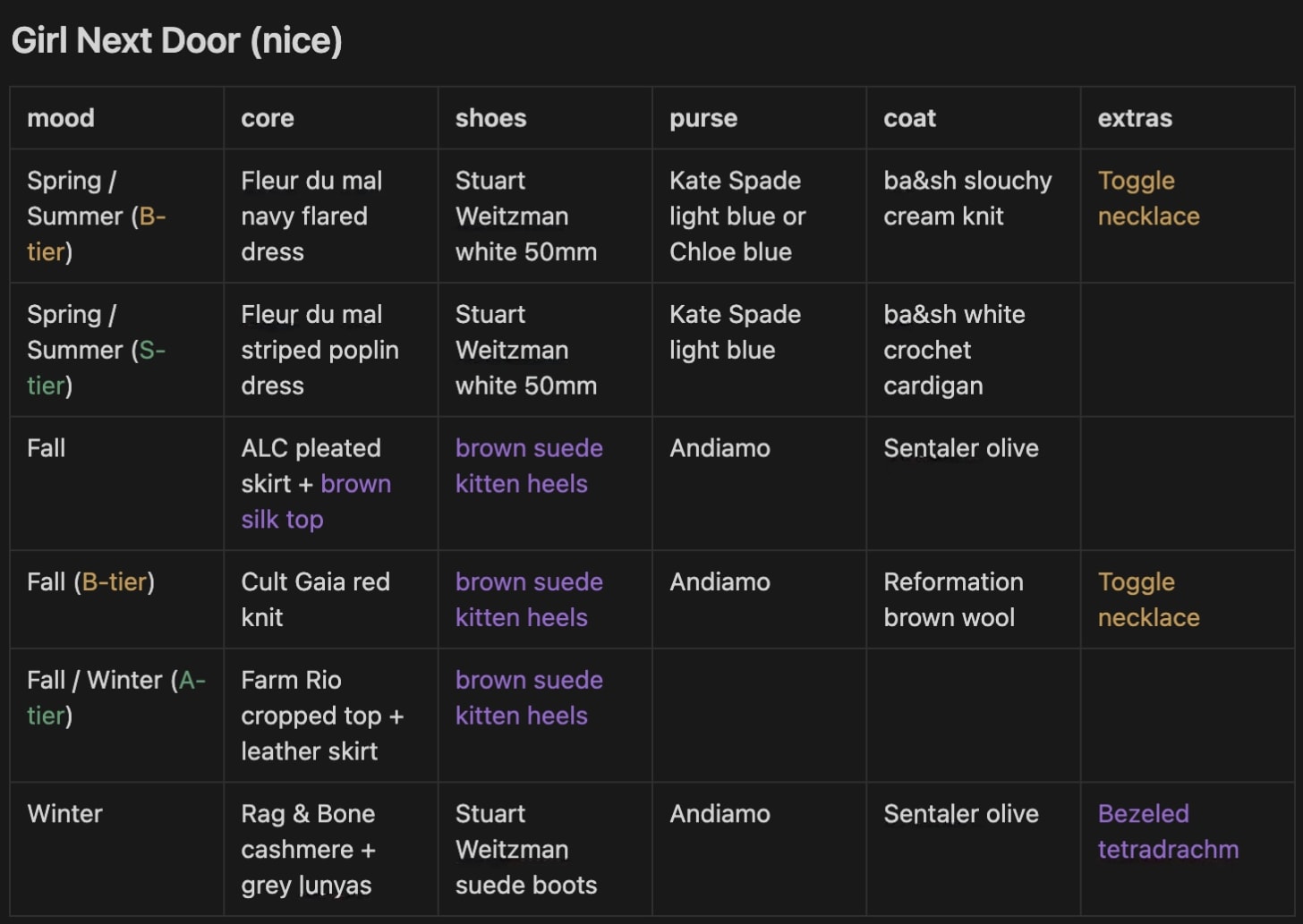 I built out outfits by season and occasion using the items from my closet doc. Then, I could see what I needed and could find the fewest items that would complete the most outfits.