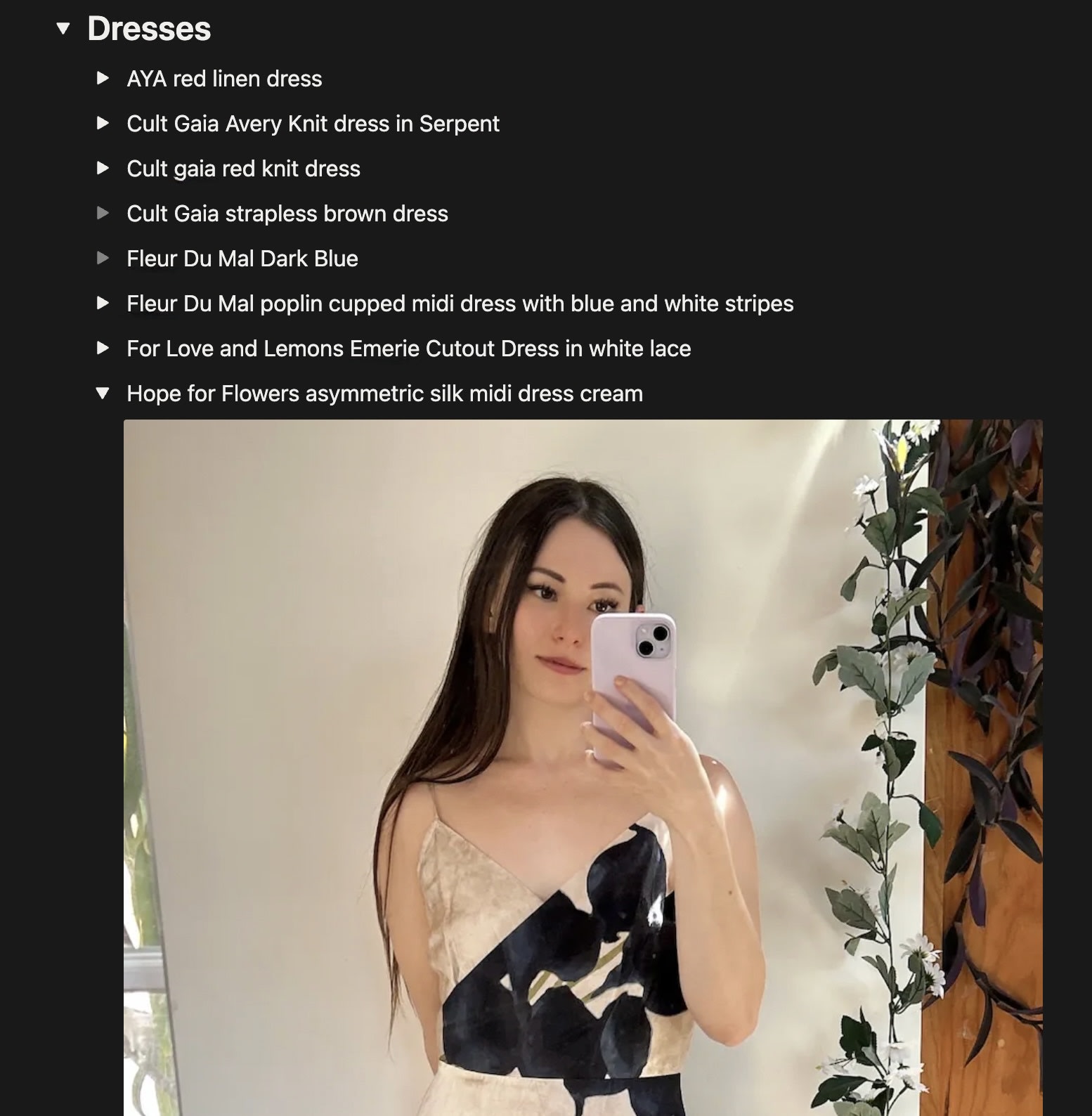 My closet was large, messy, and redundant. Sometimes I’d buy new clothing because I would forgot what I already had. So I built out a Notion doc with everything I owned, complete with photos of me wearing those items. I figured that it would save me from duplicate purchases, but it’s done more than that: