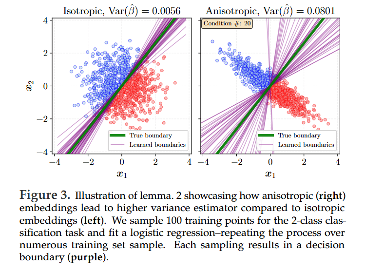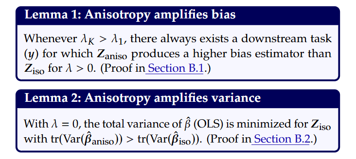 For linear probes, they show that any deviation from isotropy (i.e., an anisotropic covariance structure) amplifies both the bias (Lemma 1) and the variance (Lemma 2) of the learned downstream predictor.