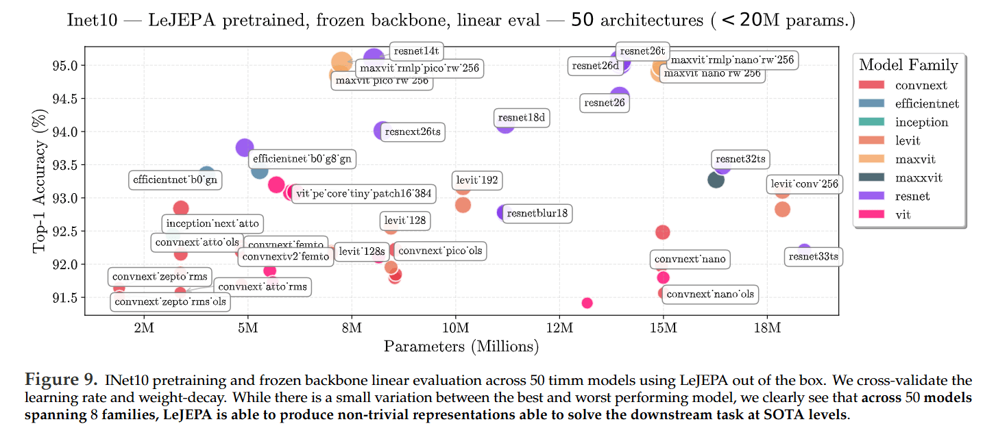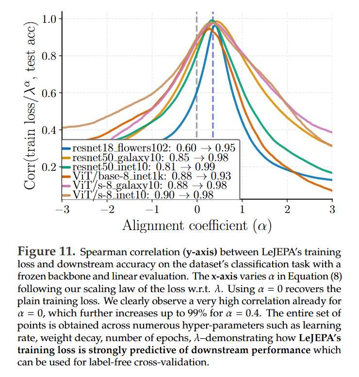 An Informative Training Loss: A significant breakthrough is that LeJEPA’s training loss is highly predictive of downstream performance. The authors show up to a 99% Spearman correlation between a scaled version of the training loss and the final linear probe accuracy (Figure 11). This provides a reliable, cheap, and label-free signal for model selection—a long-sought-after feature in SSL.