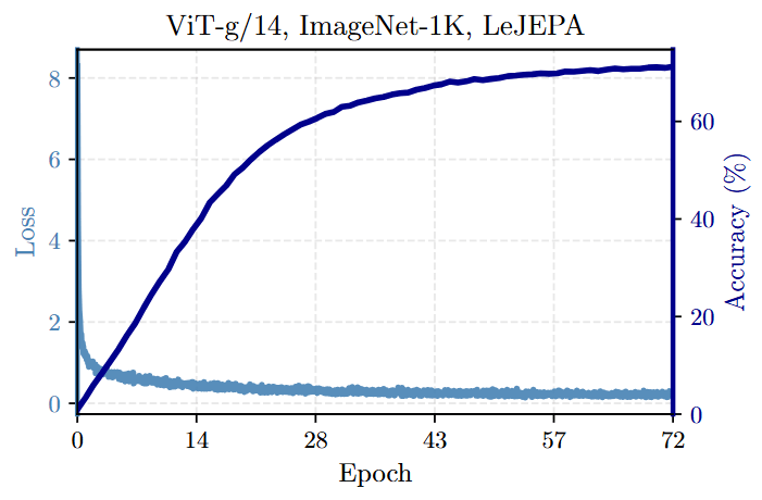 State-of-the-Art Efficiency: On ImageNet-1K, LeJEPA achieves 79% top-1 accuracy with a ViT-H/14 model and consistently matches or outperforms prior methods while often requiring significantly shorter training schedules (e.g., 100 epochs vs. I-JEPA’s 300) (Table 2).