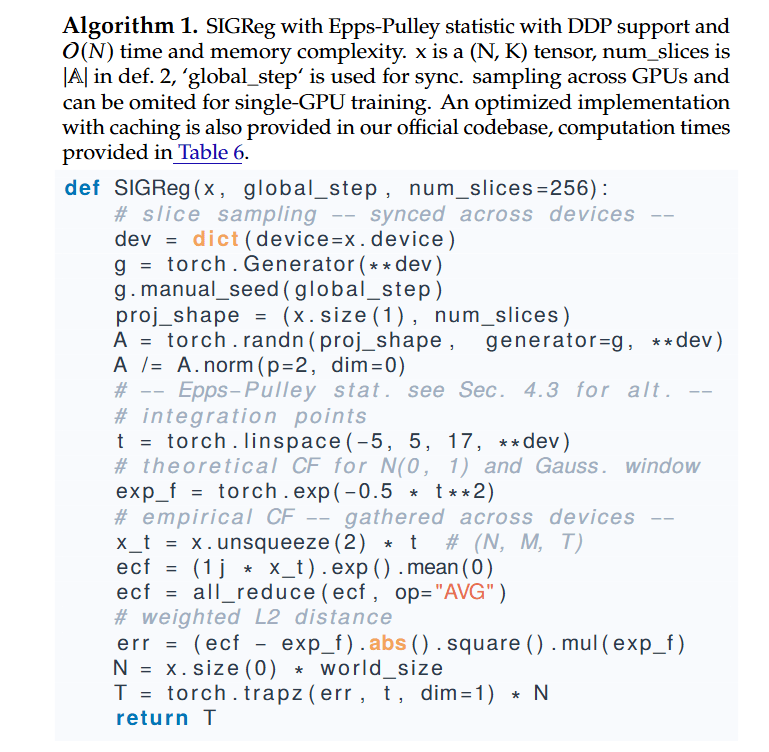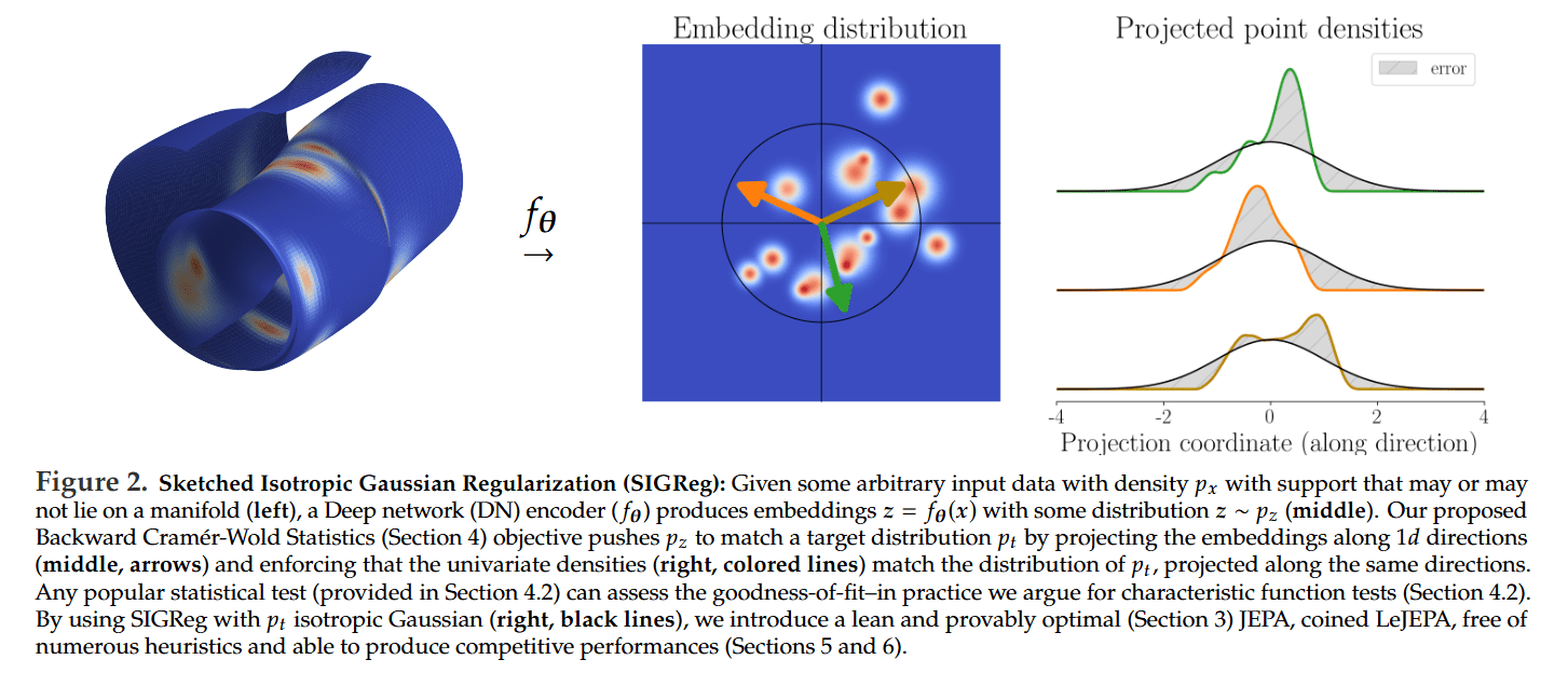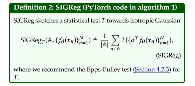 With a clear target in mind, the challenge becomes how to enforce this distribution on a high-dimensional embedding space without incurring prohibitive computational costs or training instability. The authors’ solution is a novel objective called Sketched Isotropic Gaussian Regularization (SIGReg) (Definition 2).