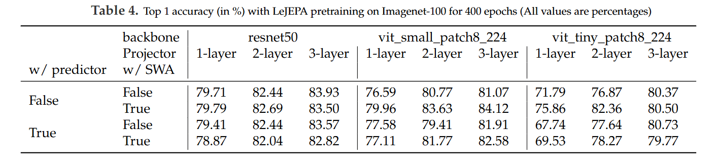 The results are striking: LeJEPA achieves state-of-the-art performance without a predictor, a teacher, or stop-gradients, drastically simplifying the entire training process (Table 4).