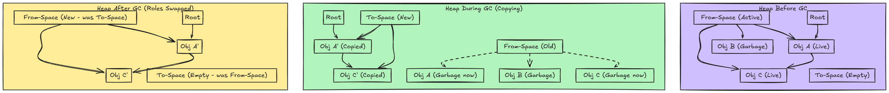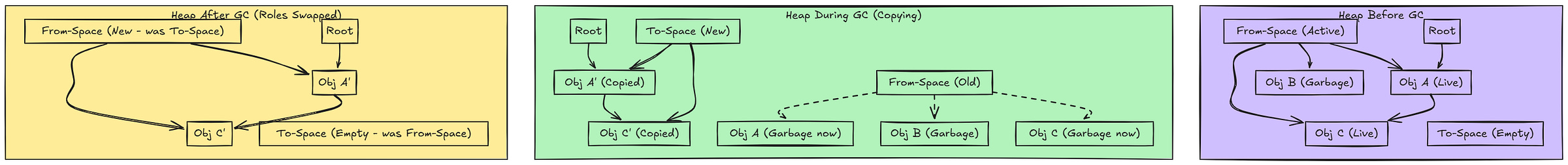 The roles of From-Space and To-Space are then swapped. The (now former) From-Space is entirely free, and To-Space becomes the new From-Space for future allocations.