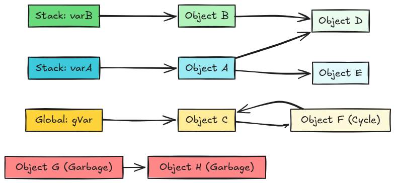 Objects on the heap often reference other objects, forming a complex interconnected structure called an object graph. GC traverses this graph starting from the roots.