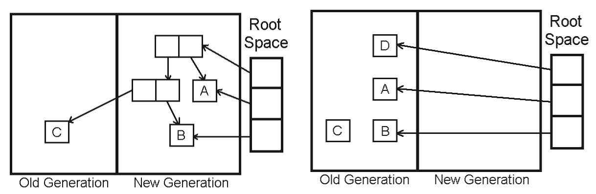 Heap = [FromSpace, ToSpace] AllocationPointer = StartOf(FromSpace) function Allocate(size): if AllocationPointer + size > EndOf(FromSpace): Collect() if AllocationPointer + size > EndOf(FromSpace): // Still not enough space throw OutOfMemoryError object_address = AllocationPointer AllocationPointer += size return object_address function Collect(): Swap(FromSpace, ToSpace) // ToSpace is now the new FromSpace, FromSpace is old and to be cleared AllocationPointer = StartOf(FromSpace) // New allocations go into the (new) FromSpace // ScanRootsAndCopy will copy reachable objects from ToSpace (old FromSpace) to FromSpace (new FromSpace) // and update AllocationPointer for each root in Roots: ScanRootsAndCopy(root, FromSpace, ToSpace, &AllocationPointer) // Pass AllocationPointer by reference Clear(ToSpace) // The old FromSpace (now ToSpace) can be cleared function ScanRootsAndCopy(root_reference, current_from_space, current_to_space, current_alloc_ptr_ref): // Simplified: Imagine root_reference points to an object in current_to_space (the old FromSpace) object_in_old_space = GetObject(root_reference) if object_in_old_space was already copied: update root_reference to point to object's new_address_in_current_from_space else: new_address = *current_alloc_ptr_ref Copy object_in_old_space to new_address in current_from_space *current_alloc_ptr_ref += size_of(object_in_old_space) Mark object_in_old_space as copied and store its new_address (forwarding pointer) update root_reference to point to new_address for each child_reference in the newly copied object (in current_from_space): ScanRootsAndCopy(child_reference, current_from_space, current_to_space, current_alloc_ptr_ref)Note: The actual implementation of ScanRootsAndCopy often uses Cheney's algorithm, which is a breadth-first approach and avoids deep recursion by using the To-Space itself as a queue.
