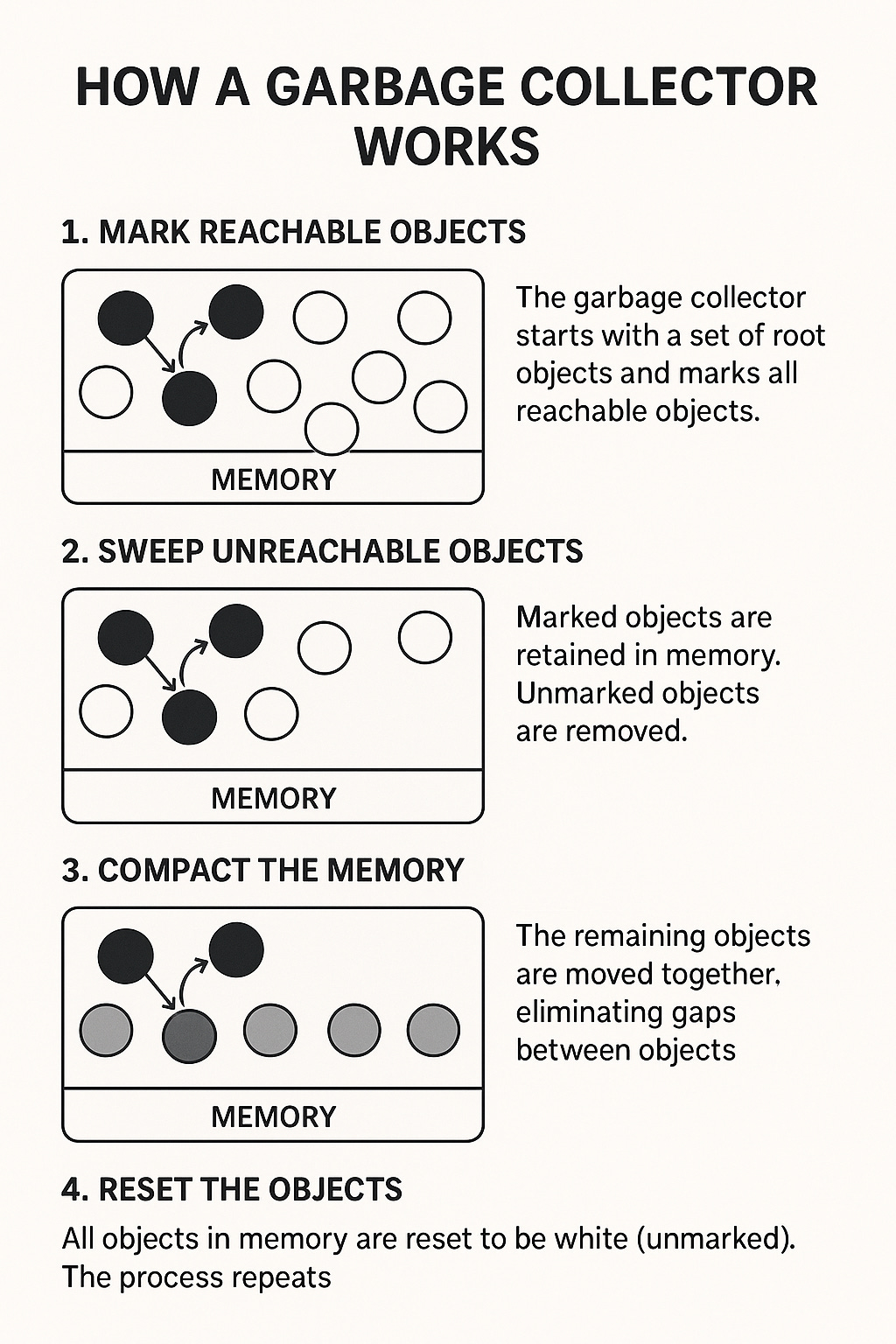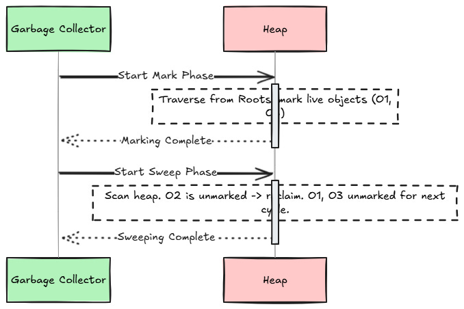 Sweep Phase: Iterate through the heap. If an object is not marked, reclaim its memory. Marked objects are unmarked for the next cycle.