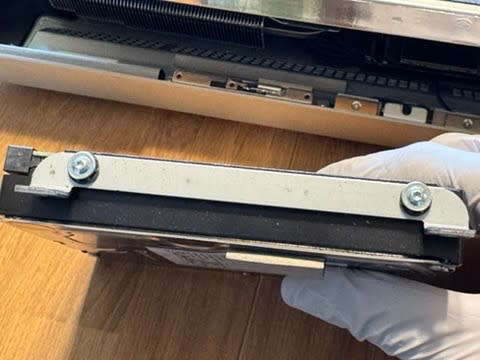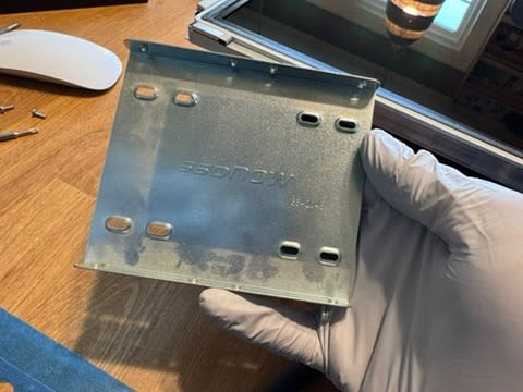 Once the drive is out, simply remove the bracket on the top side and the mounting pegs on the bottom side. Now from here, you could take the short cut of just taping the SSD into place, but I happened to have an extra 2.5 inch to 3.25 inch hard drive adapter laying around so I went ahead and mounted the SSD, pegs, and mounting bracket to it.