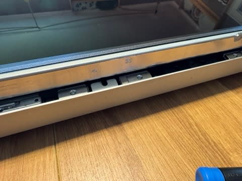 Once unscrewed, carefully lift the panel up a bit. Unlike the 2007 iMac, you don’t actually have to fully remove the panel, which is good because this thing is big, heavy, and prone to collecting dust and smudges. To dislodge the panel I just used my screwdriver to pry it up slightly so I could fit my fingers under it and lifted it up about 3 inches or so. I then propped the LCD up with a small piece of 2x4 on either side so I could work on it, making sure to disconnect the vertical sync cable before proceeding.