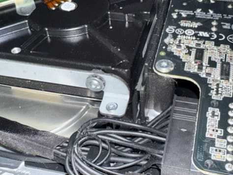 Now, the official iFixIt guide wants you to disconnect a couple other display cables to get the panel out of the way, but you really don’t have to. There is enough play in the cables to lift the display a little higher if needed to get your screwdriver to the T10 Torx hard drive bracket screws. Once unscrewed, disconnect the SATA power and data cables and the HDD sensor cable from the drive and carefully remove it making sure not to hit the other internal components.