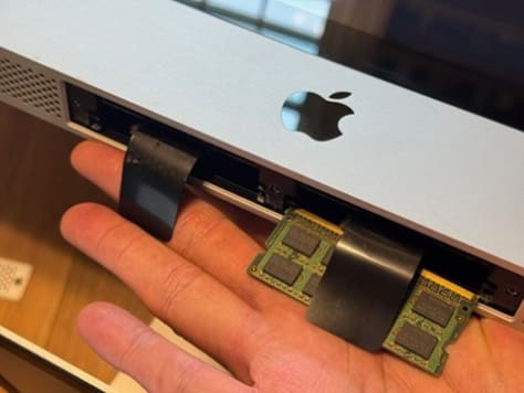 Laying the iMac down on its back, remove the RAM slot cover by loosening the three captive screws securing it and gently pull it off. Next, use your fingernail or screwdriver to lip out the black plastic pull tabs and give them a gentle tug to loosen and remove the old modules. At this point I went ahead and blew out the dust that had collected in the RAM slots and proceeded to install the four new modules.