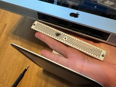 With the donor drive removed I wanted to start this upgrade with the memory. Unlike the 2007 iMac which basically required a full tear down and removal of the RAM before accessing the hard drive, the 2010 is more thoughtful in it’s design so I could go ahead and just knock this part out.