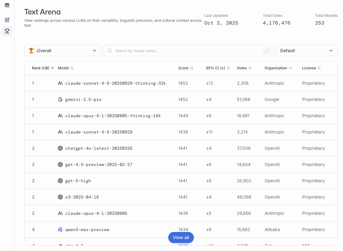 These preference votes, which are collected as shown in the figure above, are then aggregated across all users into a leaderboard that ranks different models by user preference. A current snapshot of the LM Arena leaderboard (accessed on October 3, 2025) is shown below in Figure 10.