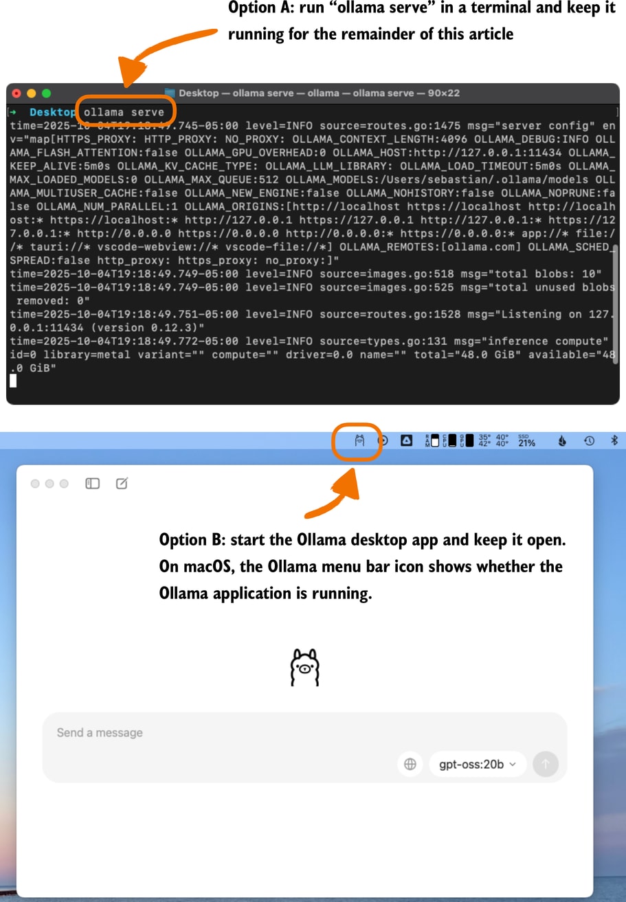 import psutil def check_if_running(process_name): running = False for proc in psutil.process_iter(["name"]): if process_name in proc.info["name"]: running = True break return running ollama_running = check_if_running("ollama") if not ollama_running: raise RuntimeError( "Ollama not running. " "Launch ollama before proceeding." ) print("Ollama running:", check_if_running("ollama"))Ensure that the output from executing the previous code displays Ollama running: True. If it shows False, please verify that the ollama serve command or the Ollama application is actively running (see Figure 13).