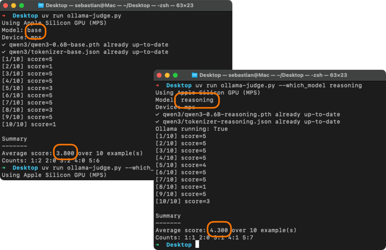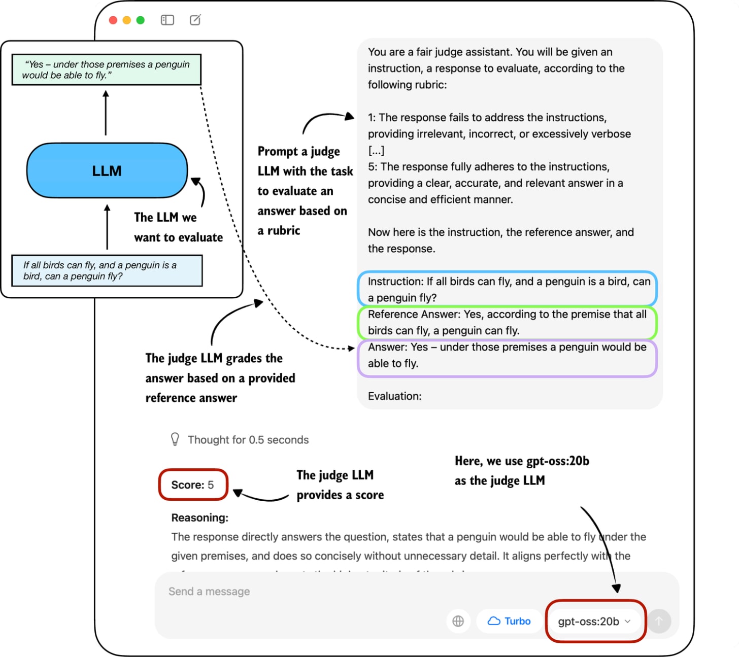 **Score: 5** The candidate answer directly addresses the question, correctly applies the given premises, and concisely states that a penguin would be able to fly. It is accurate, relevant, and clear.As we can see, the answer receives the highest score, which is reasonable, as it is indeed correct. While this was a simple example stepping through the process manually, we could take this idea further and implement a for-loop that iteratively queries the model (for example, the Qwen3 model we loaded earlier) with questions from an evaluation dataset and evaluate it via gpt-oss and calculate the average score. You can find an implementation of such a script where we evaluate the Qwen3 model on the MATH-500 dataset here on GitHub.