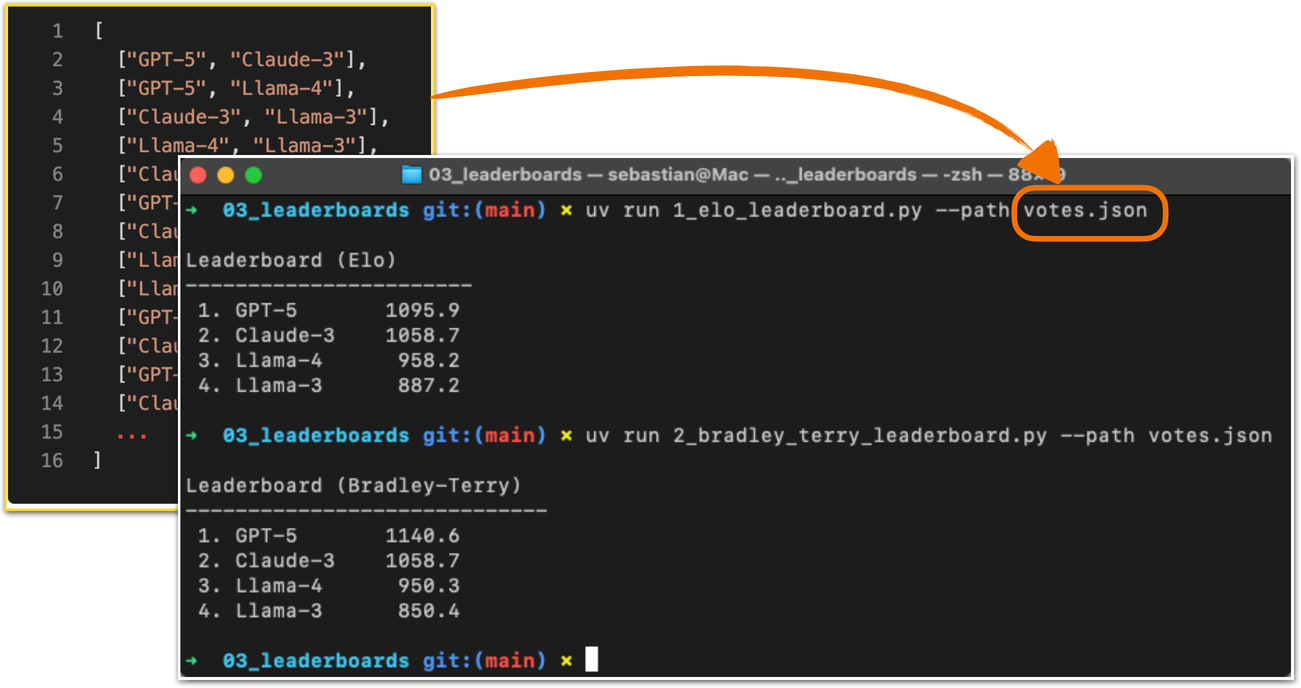 Before we look at the concrete code implementation, in short, it works as follows. Each model starts with a baseline score. Then, after each comparison and the preference vote, the model’s rating is updated. Specifically, if a user prefers a current model over a highly ranked model, the current model will get a relatively large ranking update and rank higher in the leaderboard. Vice versa, if the current model loses against a lowly ranked model, it increases the rating only a little. (And if the current model loses, it is updated in a similar fashion, but with ranking points getting subtracted instead of added.)