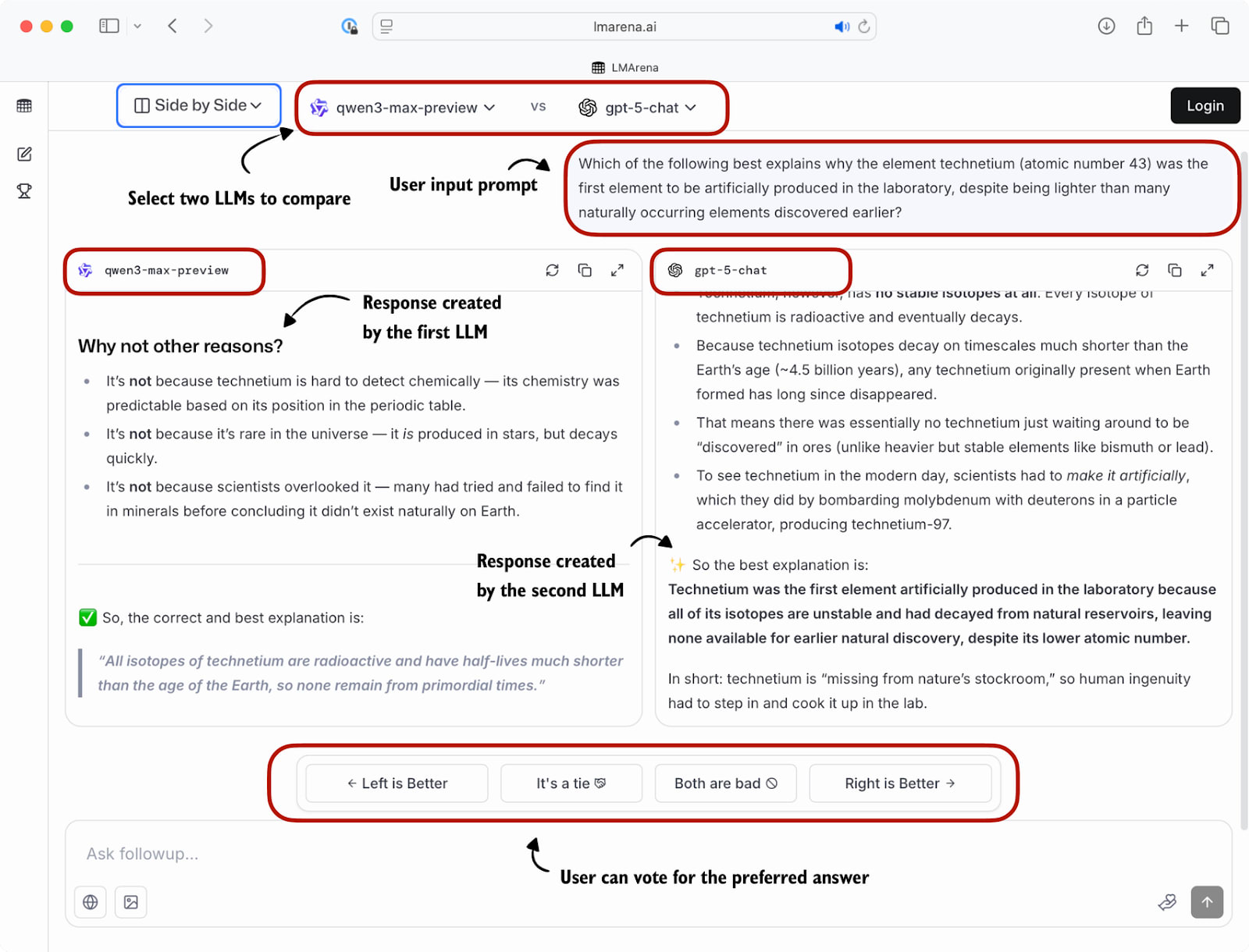 A popular leaderboard is LM Arena (formerly Chatbot Arena), where users compare responses from two user-selected or anonymous models and vote for the one they prefer, as shown in Figure 9.