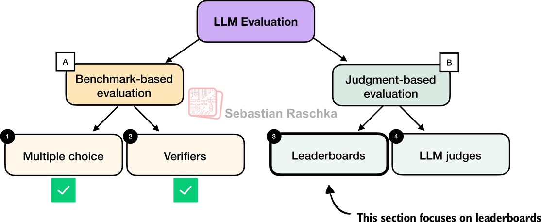 There are four common ways of evaluating trained LLMs in practice: multiple choice, verifiers, leaderboards, and LLM judges, as shown in Figure 1 below. Research papers, marketing materials, technical reports, and model cards (a term for LLM-specific technical reports) often include results from two or more of these categories.