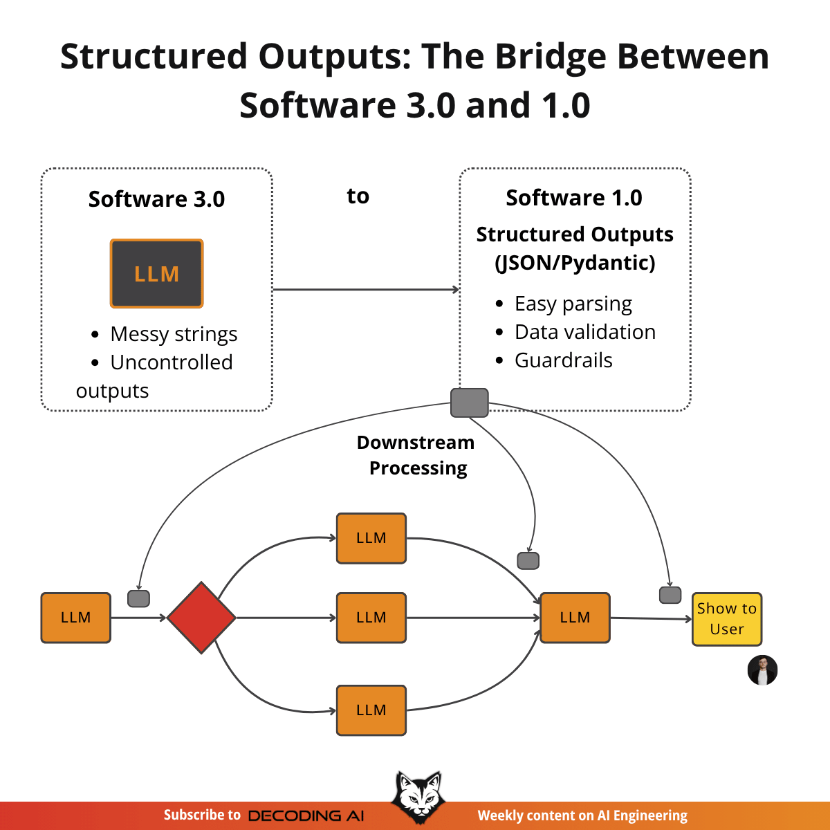 Ultimately, structured outputs create a formal contract between the LLM (Software 3.0) and your application code (Software 1.0). They are the standard method for modeling domain objects in AI engineering, connecting the probabilistic nature of LLMs with deterministic code.