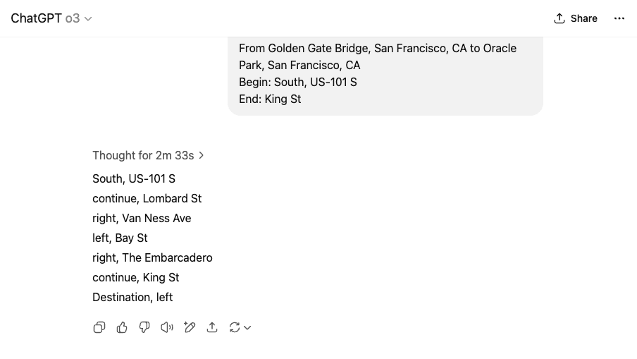 Long story short, LLMs are not good at providing turn-by-turn directions! Stick to Google/Apple Maps instead.